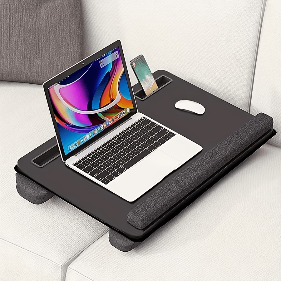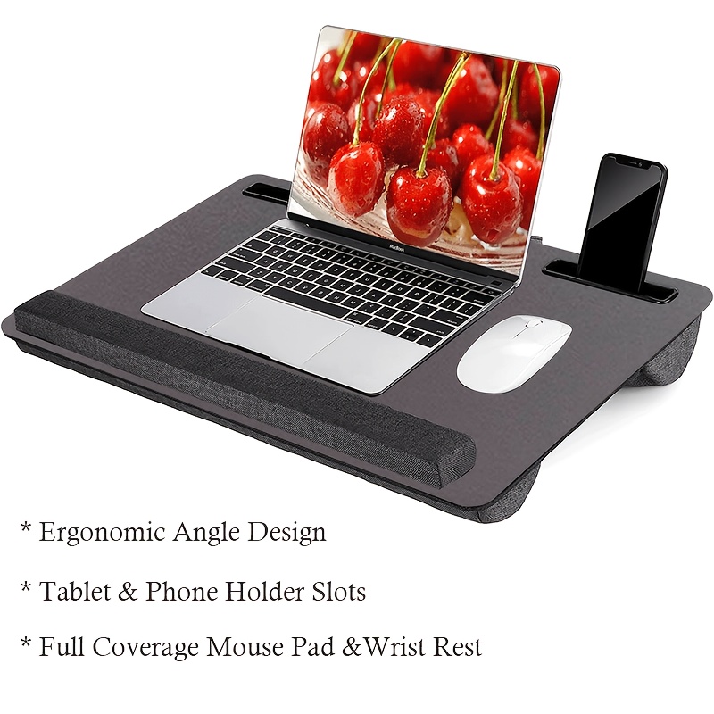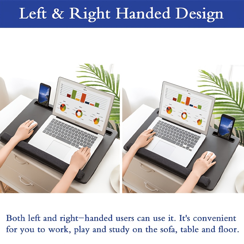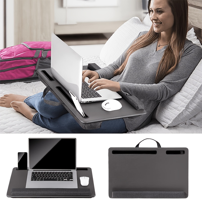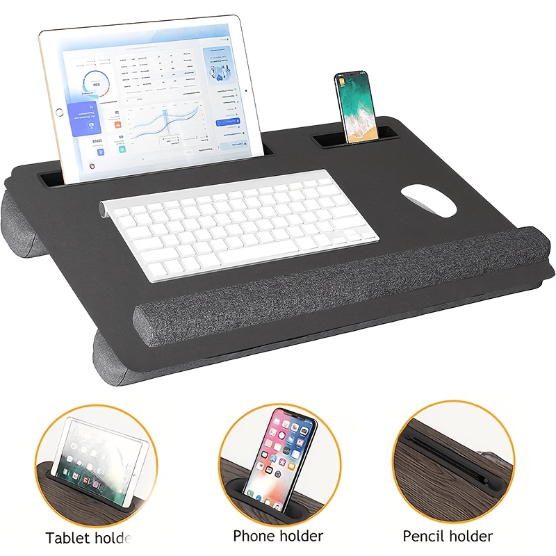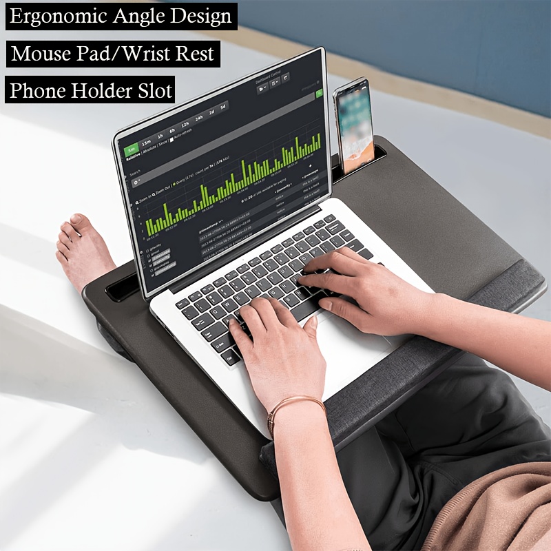 The Portable Laptop Desk provides an ergonomic and convenient solution for working from home or the bed. Featuring a full mouse pad, tablet/phone holder, anti-slip faux leather surface, and a foam cushion wrist rest, this portable desk is designed for comfort and efficiency. Ideal for laptops up to 43.18cm, it ensures a comfortable working position, whether on the couch, in bed, or at your home office workstation.