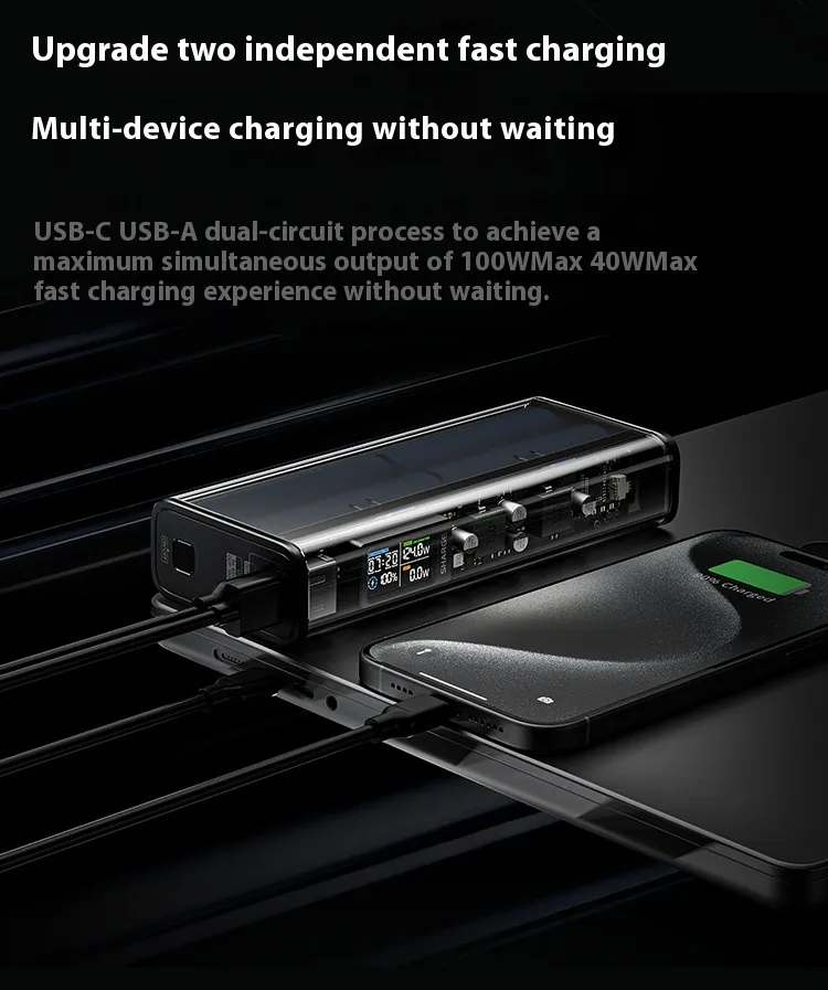 Includes AC outlets, DC ports, USB‑A and USB‑C outputs, allowing simultaneous powering and charging of phones, laptops, lights, small