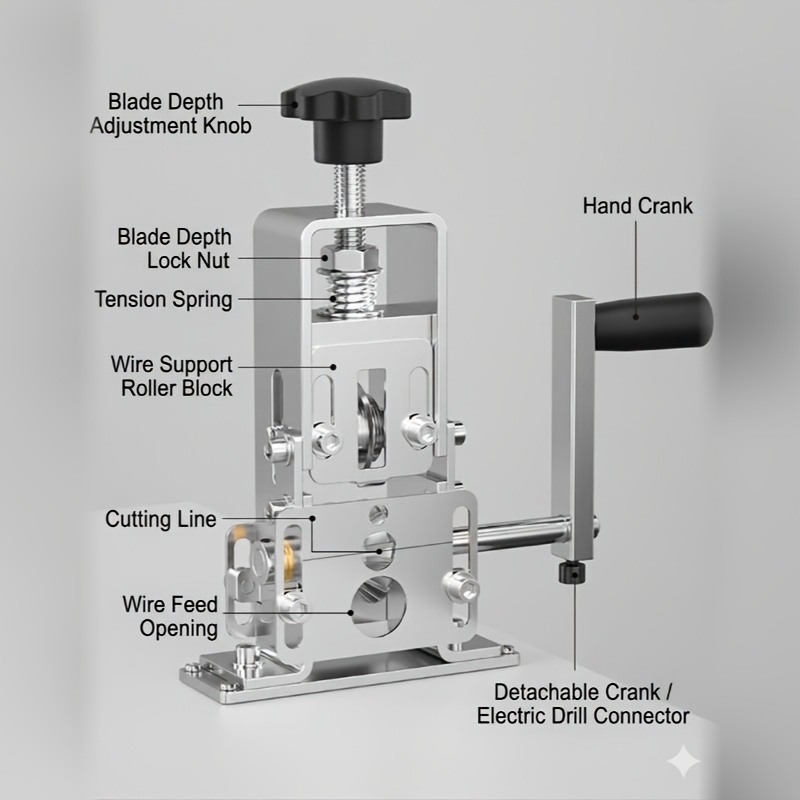 - Mountable on a Workbench: The device can be mounted securely on a workbench, providing a stable and easy-to-use setup for stripping wires.