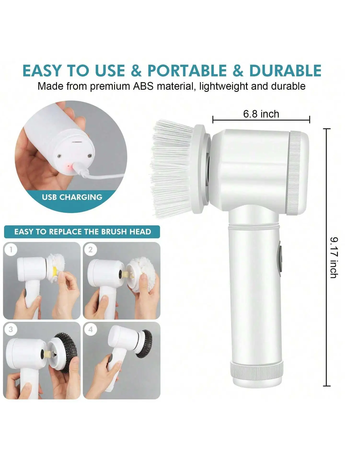 Cordless Convenience: Equipped with a rechargeable battery, this scrubber gives you the freedom to clean without the hassle