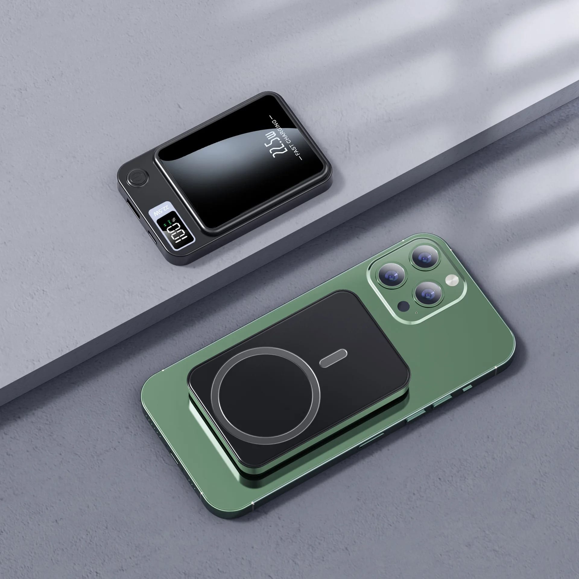 Supports 22.5W fast charging / Supports 15W Qi wireless charging / Supports Qi magnetic wireless charging / Supports Type-C input/output / Supports USB output / With magnetic ring, suitable for wireless smartphones.