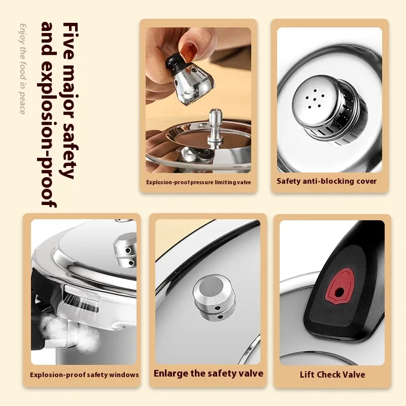 The secure lid features a multi-lock mechanism that ensures safe, airtight sealing during cooking. Safety is paramount in pressure cooking, and this design incorporates pressure-regulated valves and locking systems that prevent the lid from opening until internal pressure has safely decreased. Integrated safety features such as pressure indicators, automatic pressure release, and gasket release systems provide additional protection against over-pressure conditions.