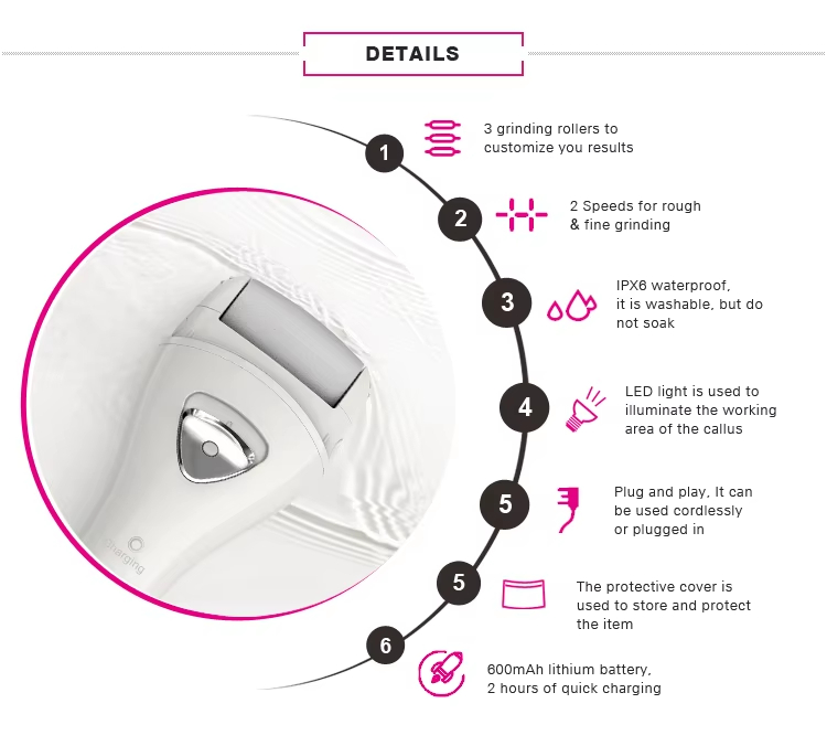 No need for cords and clutter! Our electric foot file is rechargeable, allowing for cordless use and convenience. Enjoy the freedom to pamper your feet wherever you are, whether at home or while traveling.