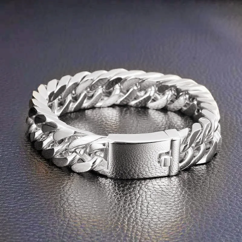 Fabricada en acero inoxidable de alta calidad, esta pulsera de cadena cubana está diseñada para ser elegante y duradera. Su acabado negro pulido resiste el deslustre y la decoloración, lo que garantiza que mantenga su aspecto audaz y elegante con el tiempo. Su robusta construcción la hace ideal para el uso diario, a la vez que ligera y cómoda en la muñeca.