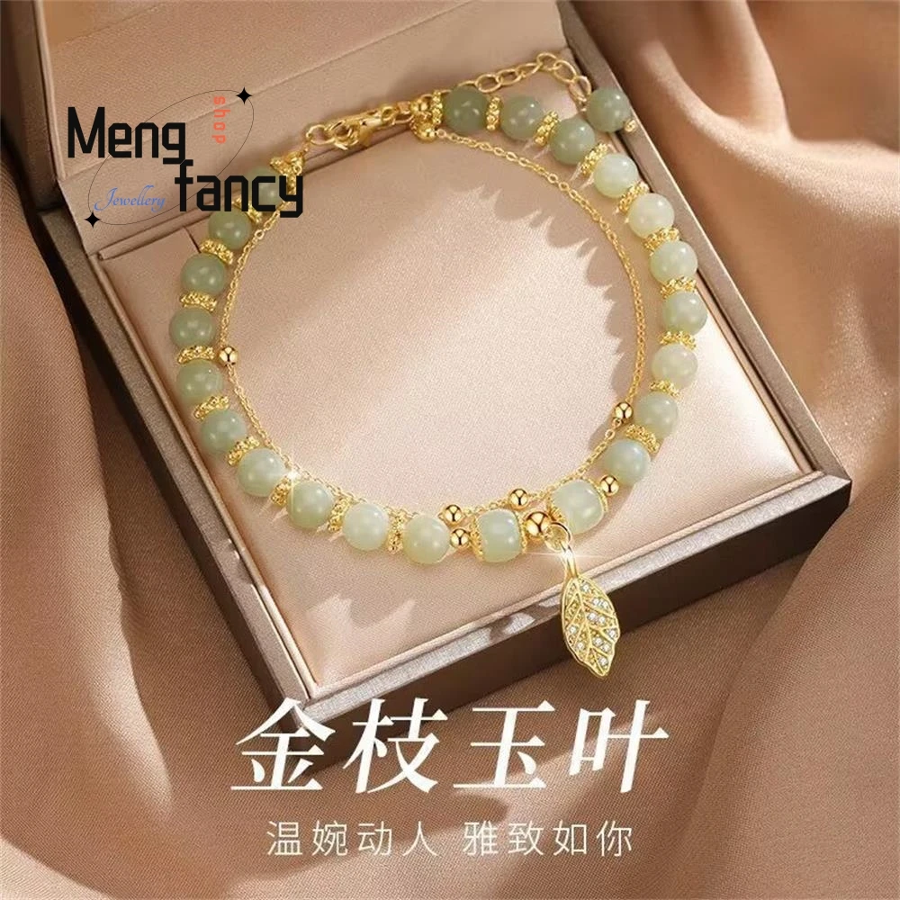 Pulsera de jaspe hetiano natural con rama dorada y hojas de jade para mujer. Joyería de moda.