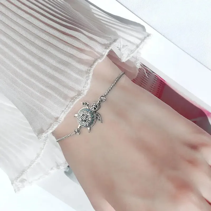 Elaborada con esmero, esta pulsera presenta un dije de tortuga marina bellamente detallado, adornado con brillantes diamantes de imitación que capturan la luz con cada movimiento. El diseño geométrico le da un toque moderno, haciendo de esta pieza algo atemporal y moderno. La pulsera está hecha con materiales de alta calidad, duraderos y suaves con la piel, lo que garantiza su comodidad durante todo el día. La cadena ajustable se adapta perfectamente a cualquier tamaño de muñeca, lo que la convierte en un accesorio versátil para mujeres y niñas de todas las edades.