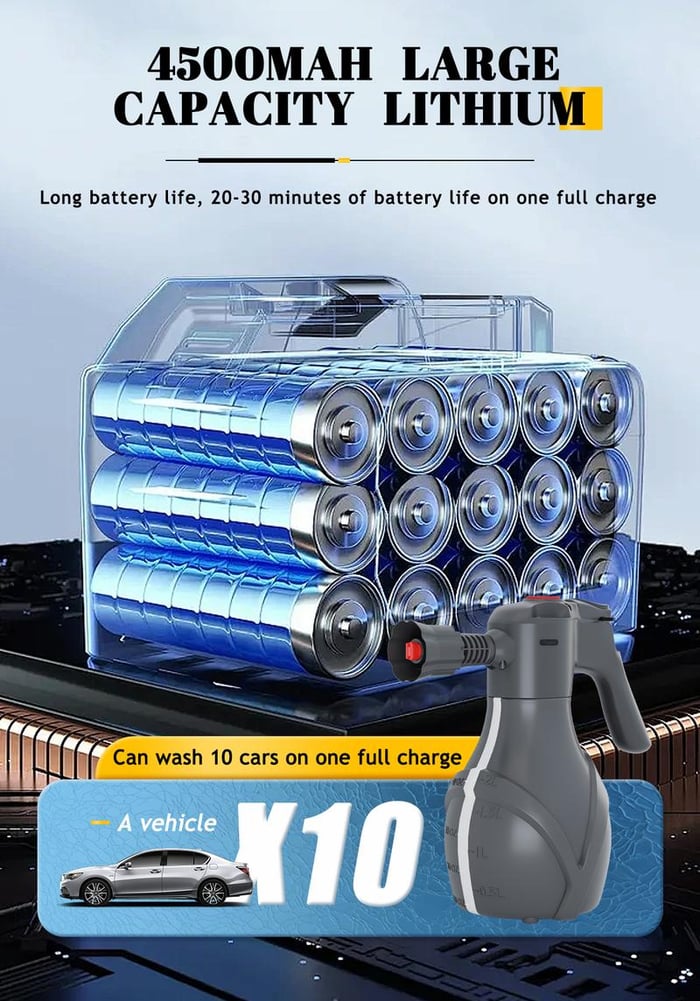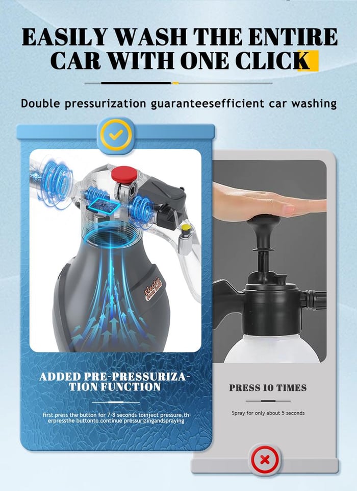 - Espuma rica y lujosa: Con doble presurización eléctrica, el rociador produce una espuma densa y delicada que penetra profundamente las superficies, descomponiendo fácilmente la suciedad y la mugre. La proporción de líquido de limpieza a agua de 1:50 maximiza la efectividad de la espuma, lo que garantiza resultados de calidad profesional en todo momento.