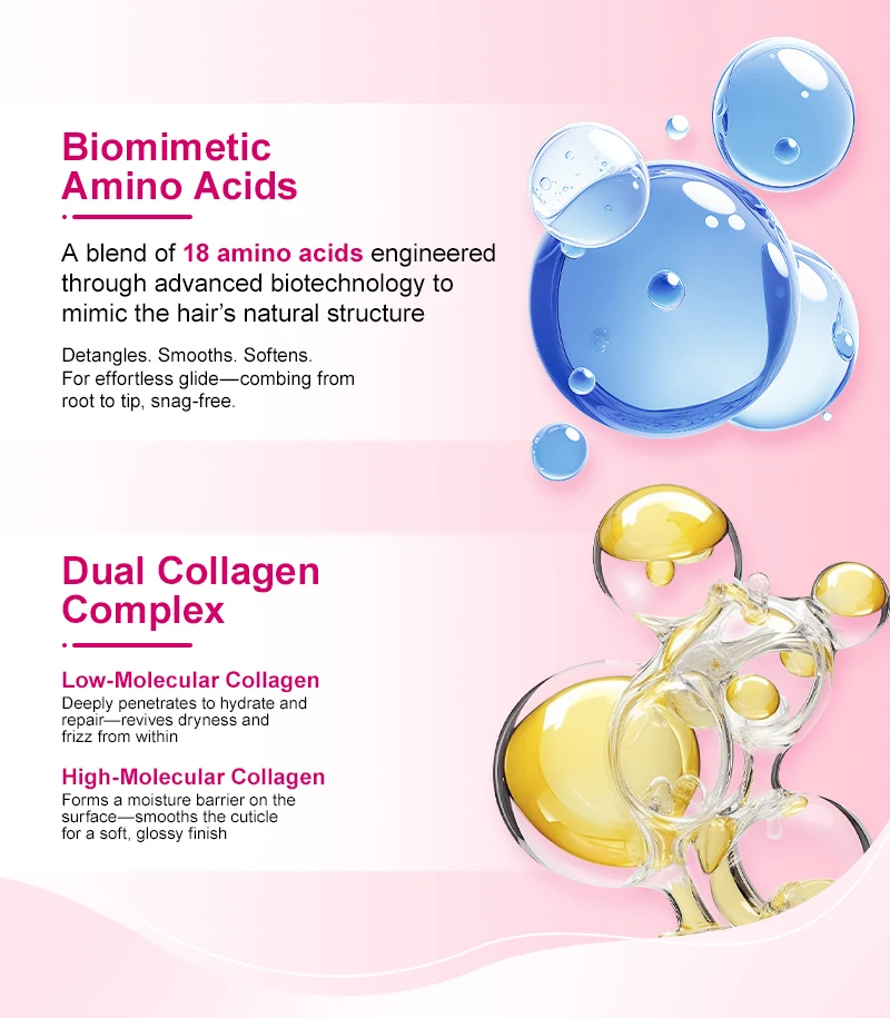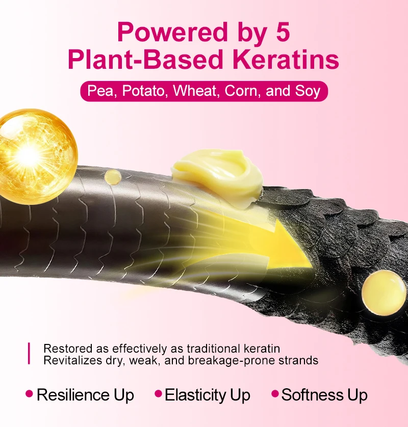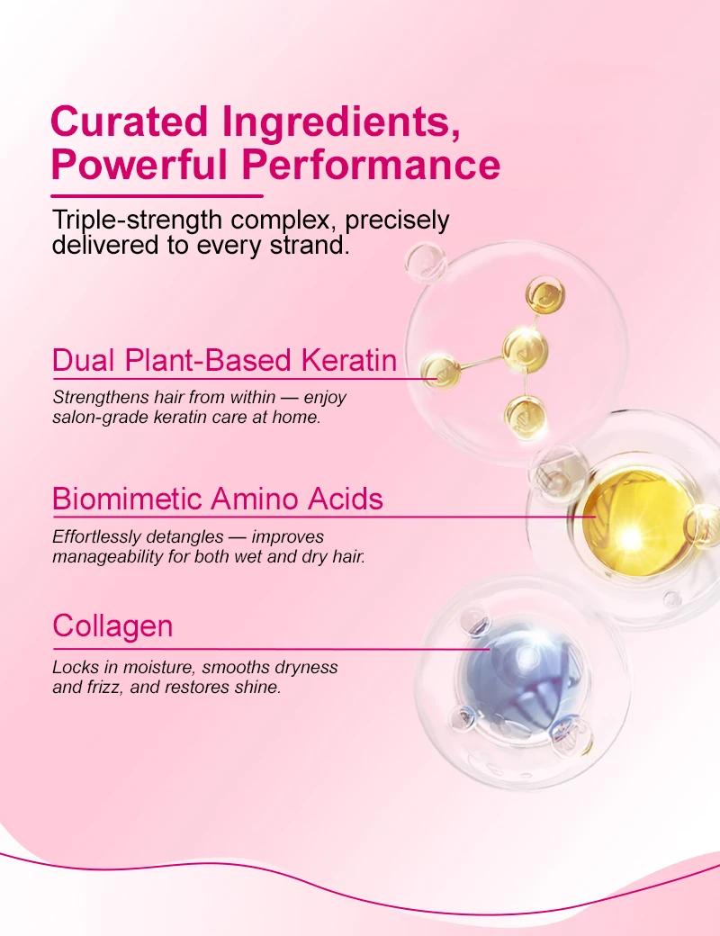 Contains collagen, Dual Plant-Based Keratin and Biomimetic Amino Acids to deeply repair dry damaged hair