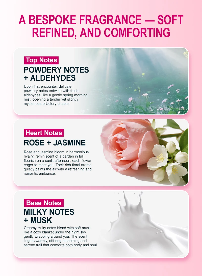 Upon first encounter, delicate powdery notes entwine with fresh aldehydes, like a gentle spring morning mist, opening a tender yet slightly mysterious olfactory chapter.