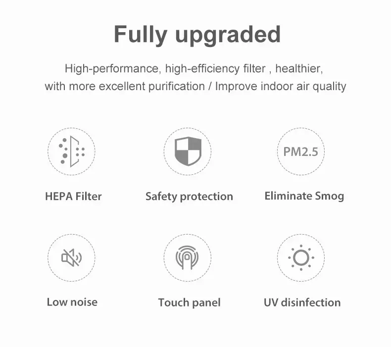 1. Filtración de alta eficiencia de 4 capas: el purificador de aire HUIQIMEI con filtro HEPA H13 de alta eficiencia puede filtrar eficazmente el 99.97% de cualquier contaminante del aire mayor a 0.3 micrones, como polen, alérgenos, polvo, humo, PM2.5, olor a mascotas, etc. Mejore la calidad del aire a su alrededor y brinde a su familia tranquilidad y comodidad con este purificador de aire para el hogar, ideal para personas con alergias y dueños de mascotas.