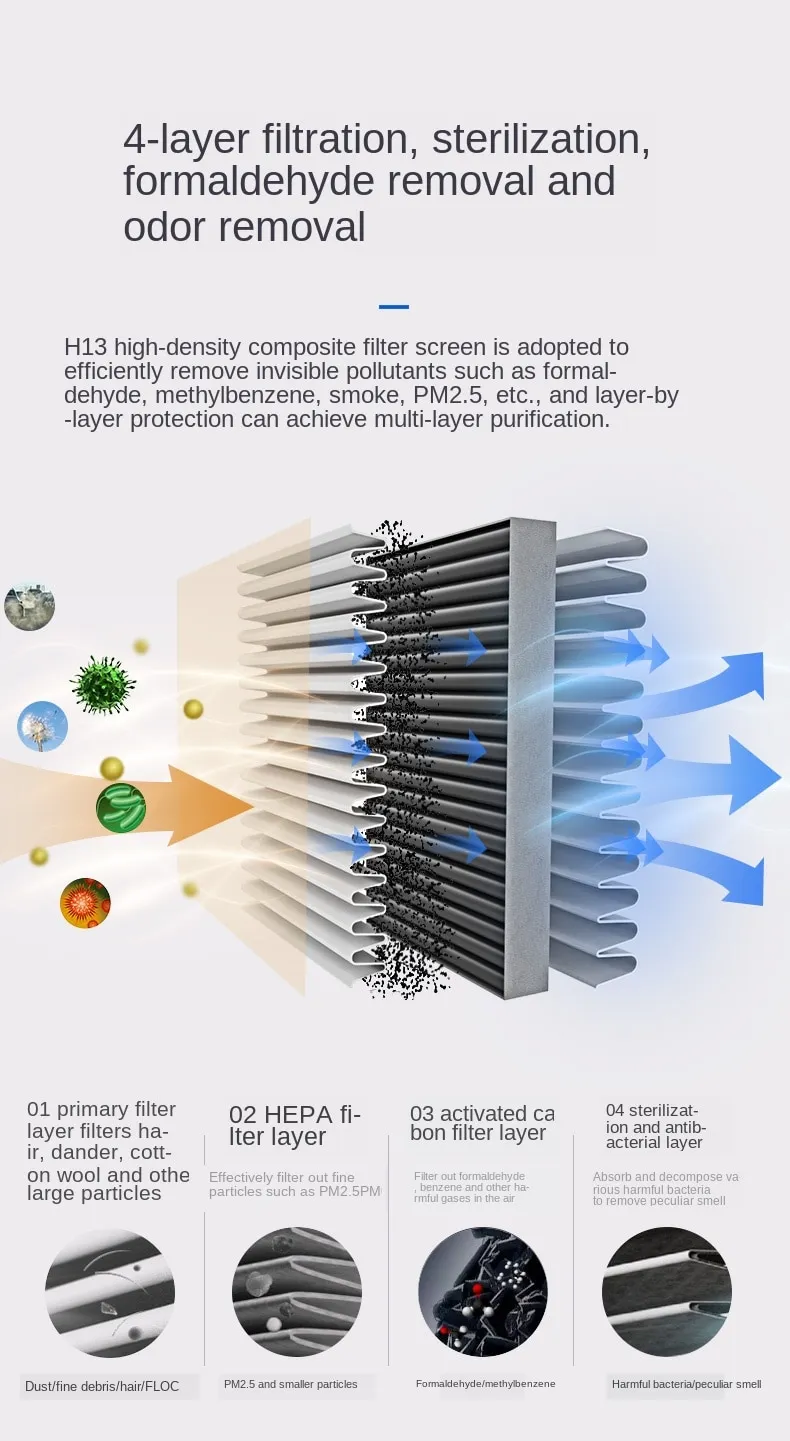 Descripción: Material: Plástico. Atributos del producto: Normal. Tamaño del paquete: 250 x 200 x 100 (1 mm). Modelo del producto: KQ-20. 1. El filtro principal filtra partículas de gran diámetro, como cabello, polen y polvo, que flotan en el aire. 2. El filtro de alta eficiencia (HEPA) filtra partículas finas de hasta 0,3 µm, como microorganismos, virus y PM2.5. 3. Equipado con un filtro de carbón activado de malla alta, que absorbe eficazmente gases tóxicos y nocivos como el formaldehído y el benceno. 4. Ventiladores de alta calidad, de gran volumen y bajo nivel de ruido, con función de arranque automático PWM y ajuste de la velocidad del viento de tres velocidades. El generador de iones negativos incorporado puede producir continuamente una alta concentración de oxígeno iónico negativo.