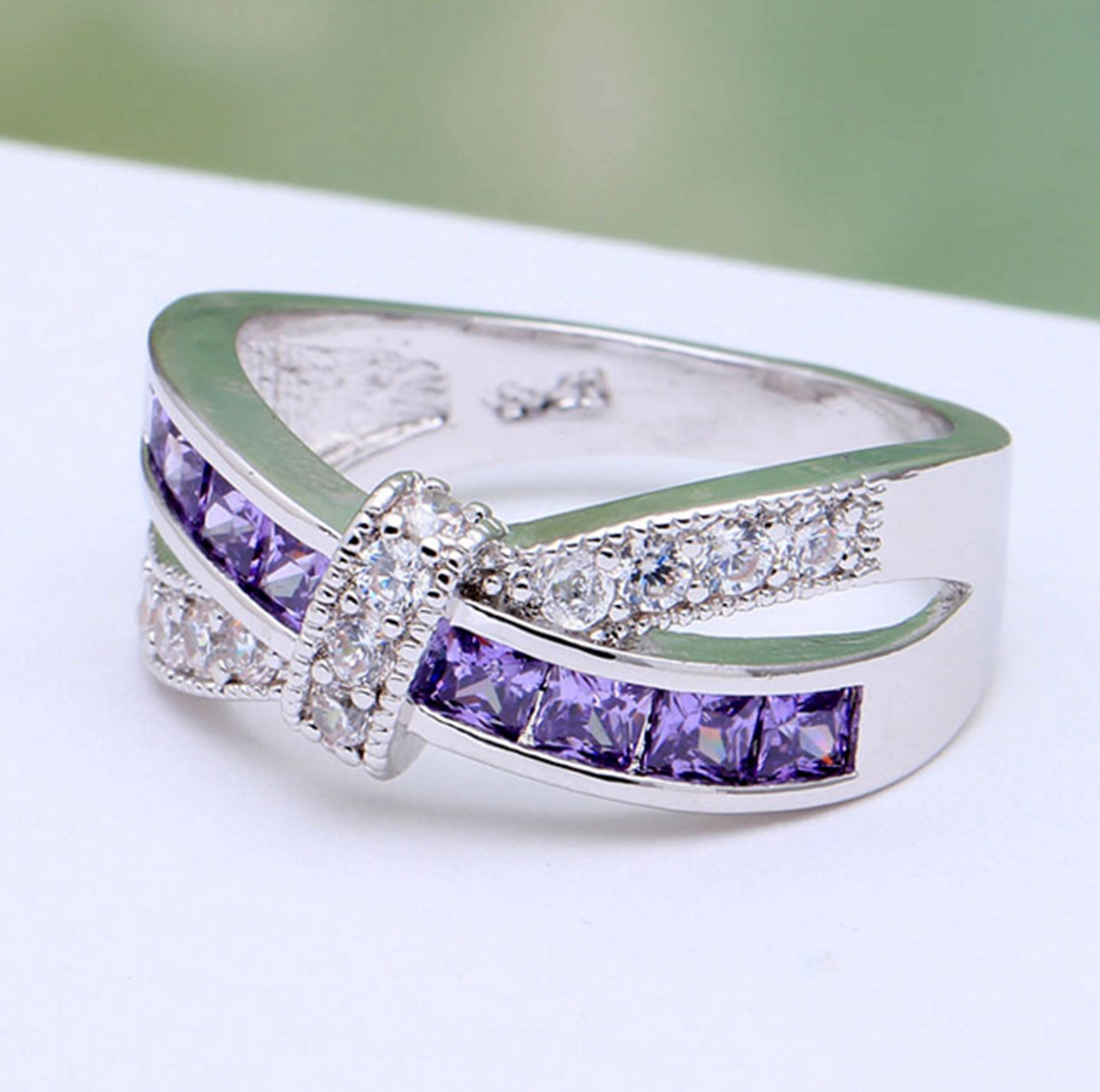 - Gemstones: Square-cut amethyst, rose pink, or aquamarine blue, accented with cubic zirconia