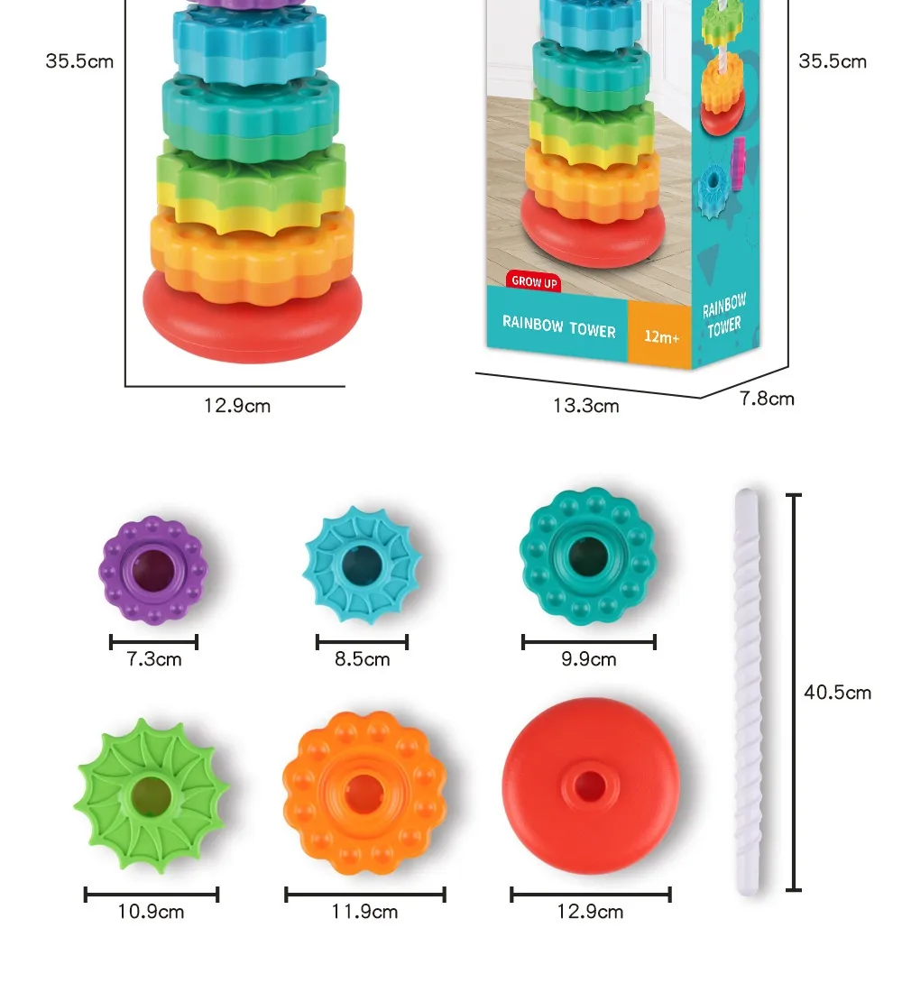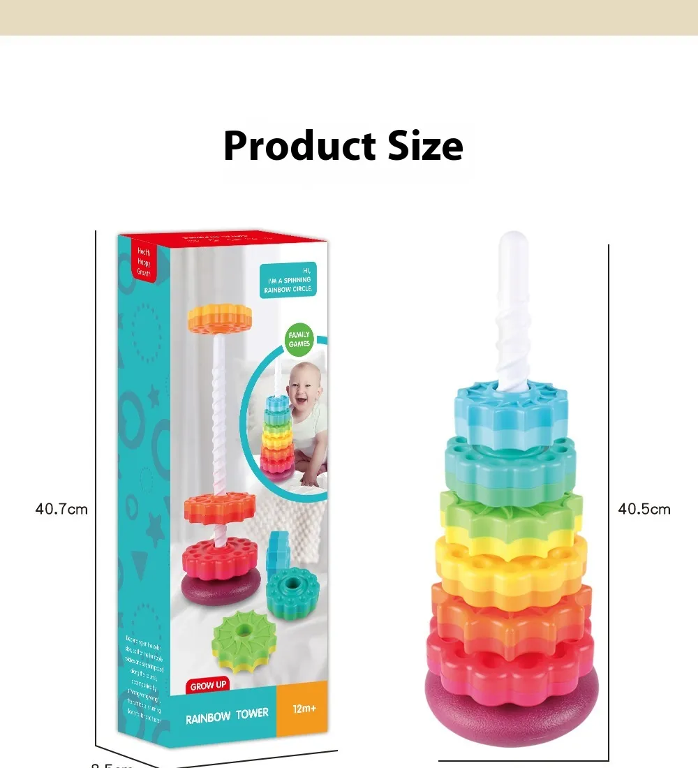 The Rainbow Rotating Tower Toy is lightweight and compact, making it perfect for playtime at home or on-the-go. Whether your baby is playing on the floor, at the table, or during car trips, this toy is easy to use and carry around. Its compact design also makes it a great choice for small spaces, such as apartments or travel setups.
