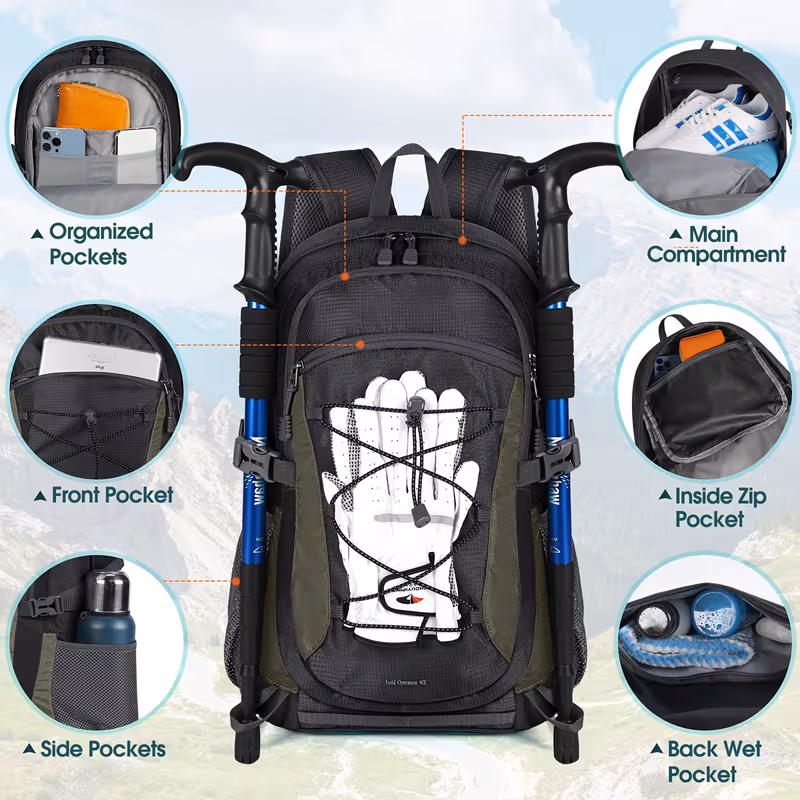 Its multi-compartment design features a spacious main pocket for bulkier items, secondary compartments for clothes or gear, mesh side pockets for water bottles, inner pockets for valuables, and front pockets for quick-access items like sunscreen, snacks, maps, or sunglasses. The internal structure helps distribute weight evenly and keeps belongings organised during fast movement or steep climbs.