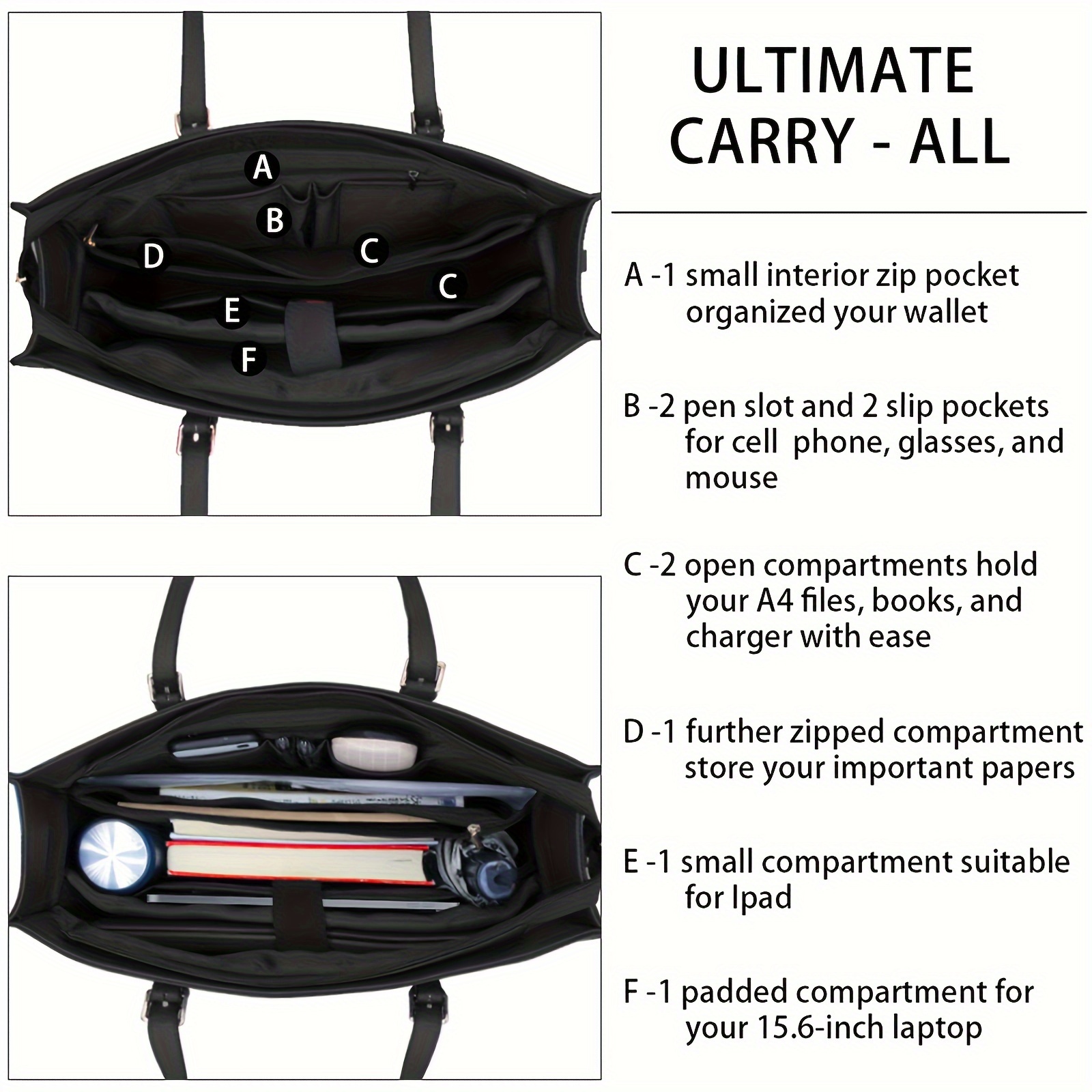 In addition to the laptop compartment, the tote offers ample room for your documents, books, makeup, and personal items, keeping everything organized and easily accessible.