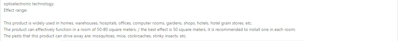 This product can drive away pests: mosquitoes, mice, cockroaches, stinky insects and so on.