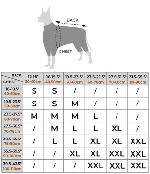 1. Measure dog's Chest and Back Length as the main reference. (e.g. We have a Border Collie, chest 66 cm, back length 55 cm, choose size M.)