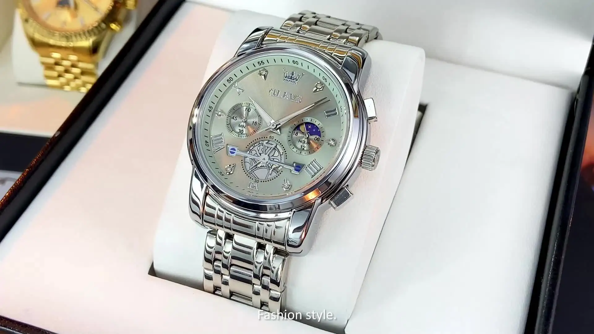 Su atractivo de alta gama y sus avanzadas funciones lo convierten en un regalo o accesorio personal ideal que añade elegancia a cualquier armario. Con su diseño atemporal y su construcción premium, el Reloj de Cuarzo Clásico OLEVS para Hombre se convertirá en una pieza preciada. Características y Beneficios del Reloj de Cuarzo Clásico OLEVS para Hombre: 1. Cronógrafo con Volante de Inercia para una Apariencia Mecánica y Elegante: El diseño con volante de inercia añade un elemento visual impactante, mostrando la mecánica del reloj. La función de cronógrafo proporciona una medición precisa del tiempo, realzando la practicidad y el estilo del reloj. 2. Visualización de Fase Lunar para Mayor Sofisticación: El indicador de fase lunar añade un toque de elegancia y tradición al reloj, convirtiéndolo en un accesorio único y significativo. Esta característica realza el atractivo clásico del reloj, proporcionándole un nivel adicional de detalle. Visualización de 24 horas para una funcionalidad mejorada:
