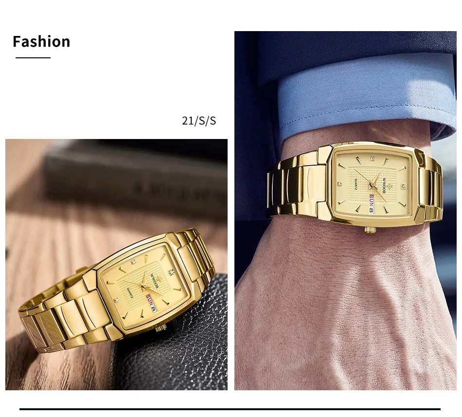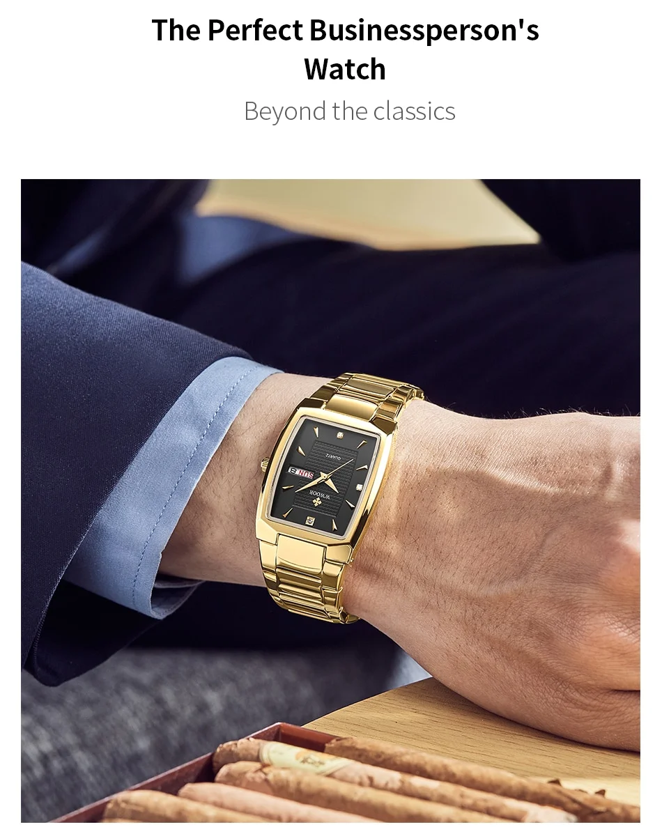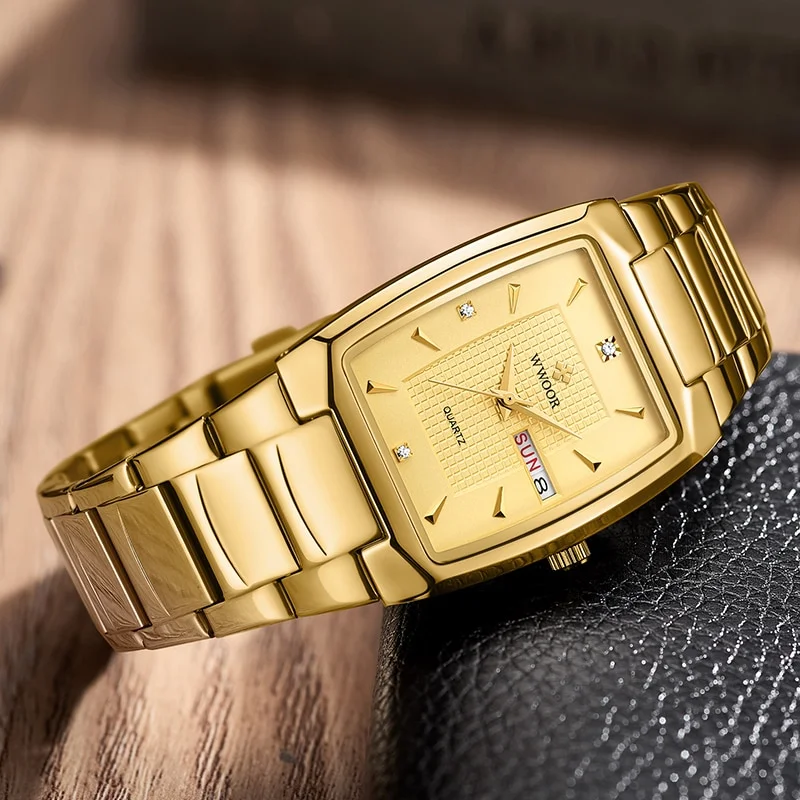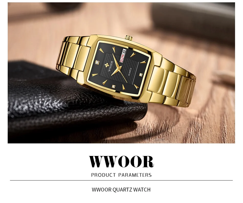 este reloj está diseñado para mantenerte en forma y añadir un toque de elegancia a tu atuendo. La construcción de acero inoxidable dorado proporciona durabilidad, mientras que el movimiento de cuarzo garantiza una hora precisa. Diseñado para la comodidad y versatilidad, este reloj es adecuado tanto para el uso diario como para eventos especiales, lo que lo convierte en una valiosa adición a la colección de accesorios de cualquier hombre. El moderno diseño cuadrado de este reloj y sus características de alta gama lo convierten en la opción perfecta para los hombres que buscan un reloj moderno pero práctico. Como regalo, es una elección considerada que refleja sofisticación y buen gusto, proporcionando una impresión duradera. Características y beneficios del reloj cuadrado para hombre WWOOR 2024: 1. Diseño único de esfera cuadrada para una elegancia moderna: La esfera cuadrada añade un toque audaz y contemporáneo al reloj, diferenciándolo de los diseños redondos tradicionales. Esta forma única proporciona un aspecto moderno que complementa cualquier atuendo, ofreciendo un giro de moda a los relojes de pulsera clásicos. Visualización de fecha para mayor funcionalidad: