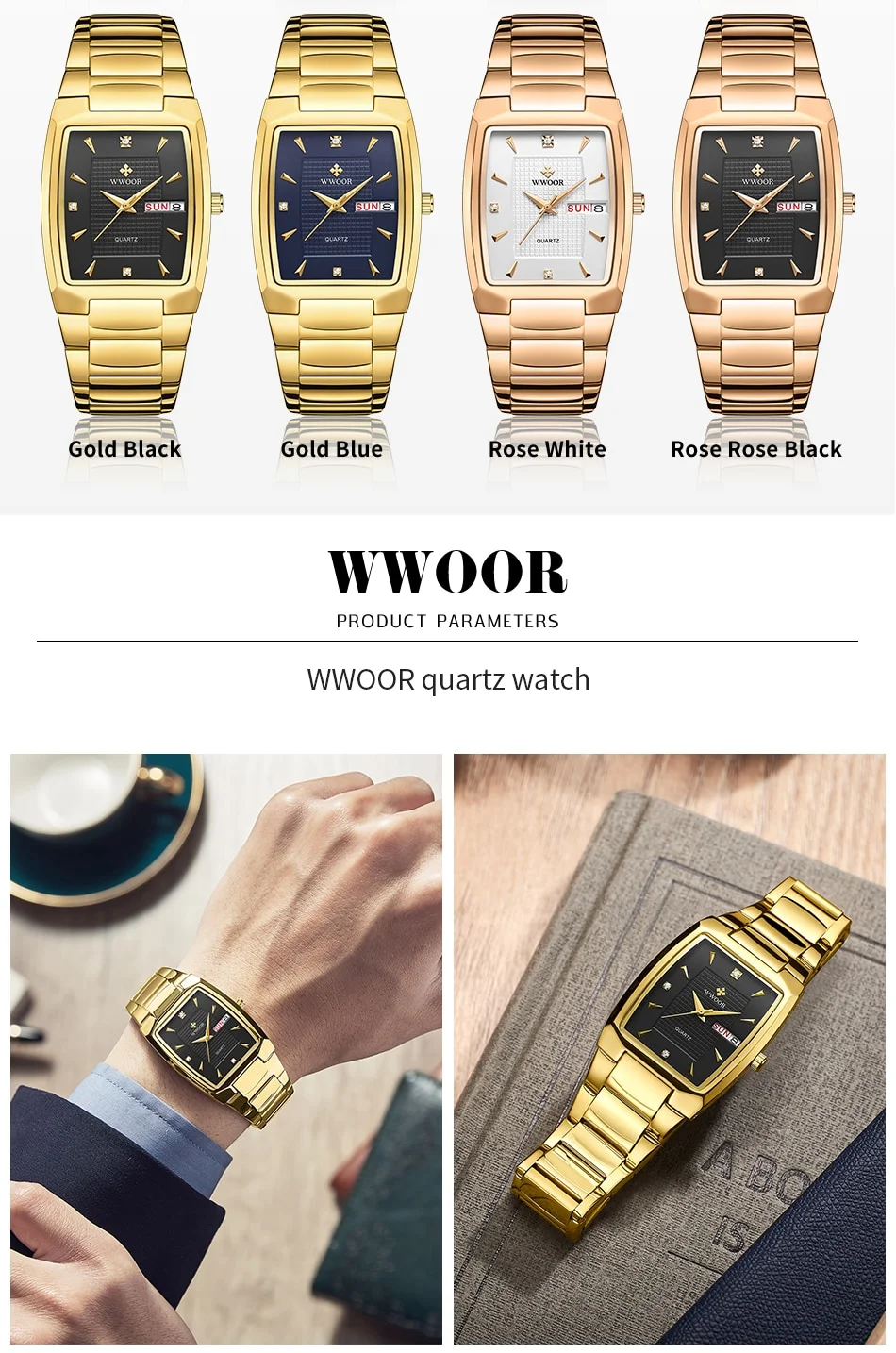Reloj de pulsera WWOOR 2024 para hombre, de lujo, de acero inoxidable dorado y cuarzo.