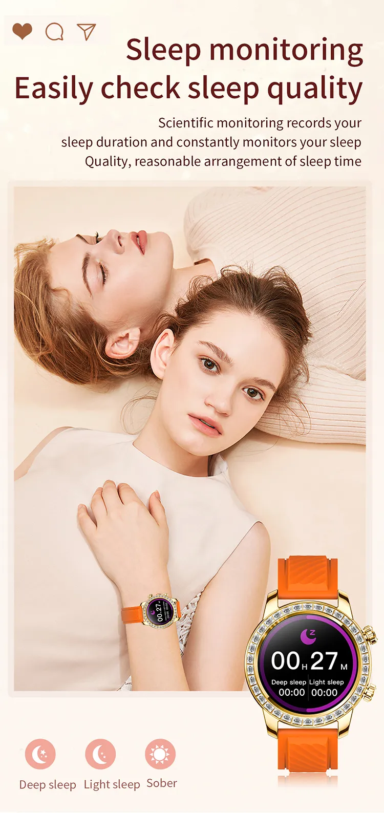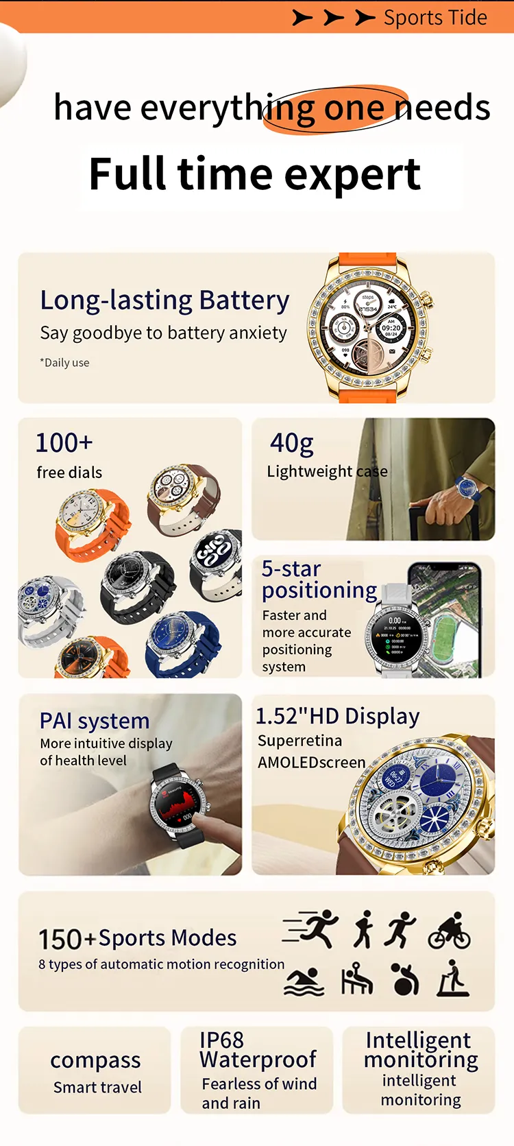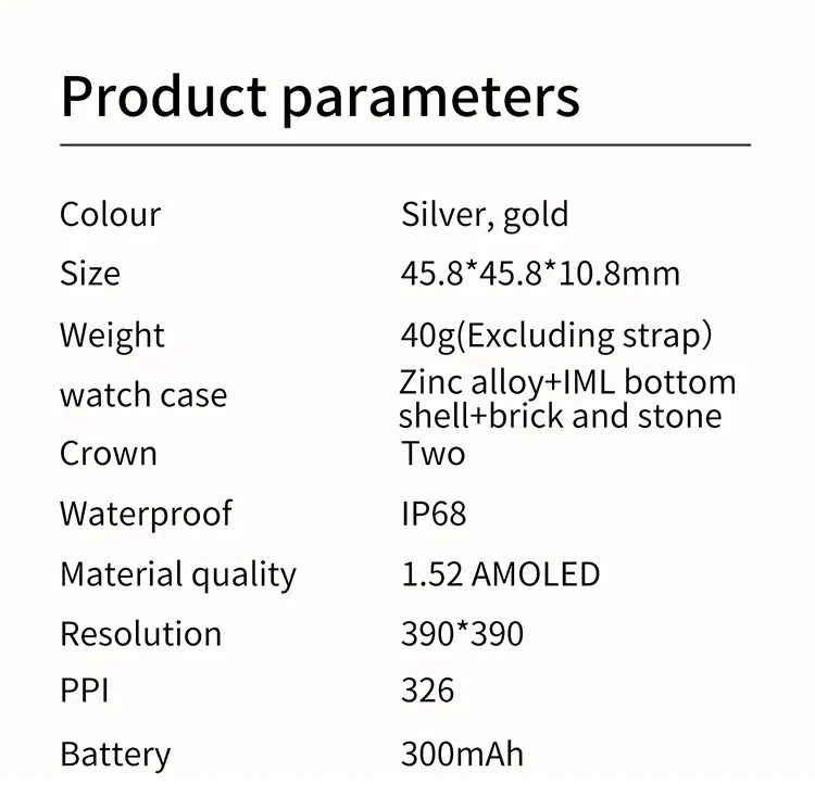 Funciones: Impermeable, fotografía, conteo de pasos, monitoreo de frecuencia cardíaca, medición de presión arterial, entretenimiento social, medición de temperatura corporal, llamadas Bluetooth, recordatorio inteligente, selfie con control remoto, monitoreo del sueño, detección de oxígeno en sangre