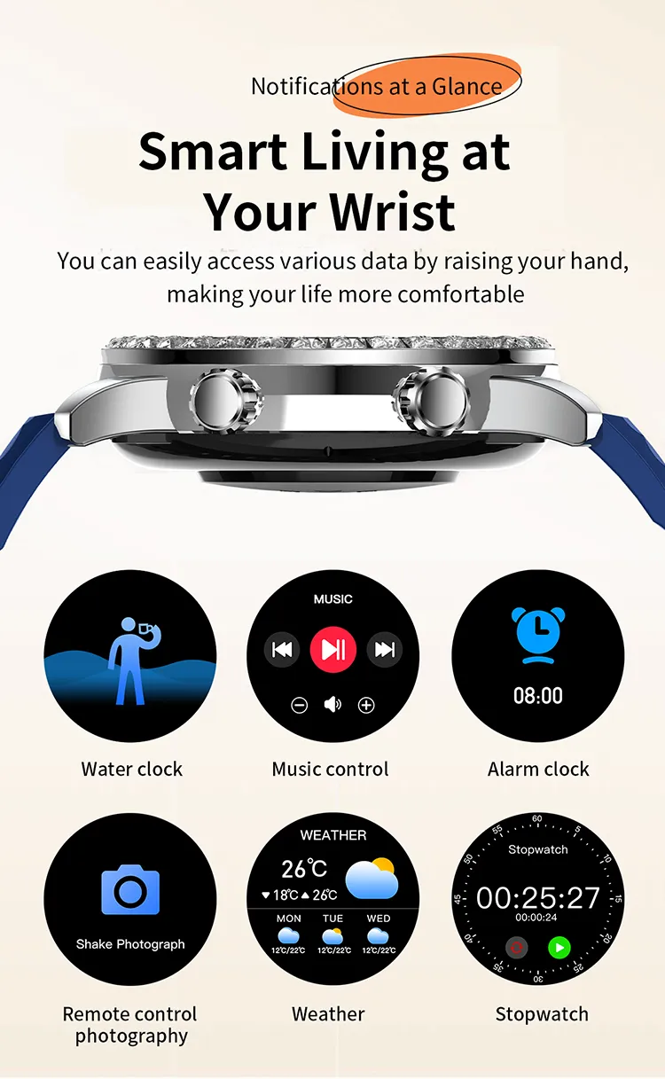 El reloj inteligente Z83 Max con disco de diamante y pulsera deportiva para exteriores combina elegancia, durabilidad y tecnología de vanguardia, diseñado para quienes buscan rendimiento y estilo. Ya sea que estés entrenando, explorando la naturaleza o asistiendo a un evento formal, este reloj inteligente combina lujo y practicidad a la perfección. El atractivo diseño de disco de diamante añade un toque de sofisticación, haciéndolo perfecto para quienes valoran la estética de alta gama. Diseñado para entusiastas del fitness y aventureros al aire libre, el Z83 Max ofrece funciones esenciales de seguimiento de la salud, como monitorización de la frecuencia cardíaca, monitorización de oxígeno en sangre (SpO2), conteo de pasos y análisis del sueño. Mantén la motivación con objetivos de fitness personalizables y datos de actividad en tiempo real. Este reloj también está equipado con modos deportivos que monitorizan tu rendimiento en diversas actividades, como correr, senderismo y ciclismo. La gran pantalla táctil de alta definición garantiza una navegación sencilla, mientras que su elegante diseño para exteriores aumenta su durabilidad. La correa ofrece comodidad y flexibilidad para largas horas de uso, lo que la hace perfecta para entrenamientos intensos o aventuras prolongadas. Además, con resistencia al agua hasta IP67, este smartwatch soporta sudor, salpicaduras e inmersiones breves, lo que te garantiza estar conectado y en forma en cualquier condición climática. Vincula el Z83 Max con tu smartphone para recibir notificaciones de llamadas, mensajes y redes sociales, y no perderte ninguna actualización importante. La batería de larga duración garantiza un rendimiento fiable, ofreciendo hasta varios días de uso con una sola carga. Con su combinación de monitorización de actividad física, funcionalidad de smartwatch y un diseño lujoso, el brazalete deportivo Z83 Max Full Diamond Disc es el accesorio definitivo para quienes valoran la salud, el estilo y el rendimiento. Ya sea que lo regale o lo agregue a su colección personal, este reloj inteligente lleva la elegancia