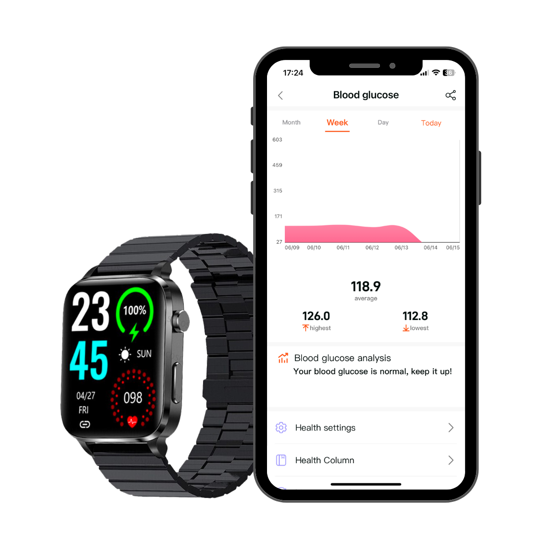 Para quienes viven con diabetes, el control constante de los niveles de azúcar en sangre es esencial para mantener una buena salud. Sin embargo, los métodos tradicionales de análisis suelen implicar dolorosos pinchazos en el dedo. Qué horrible es sentir que ya no puedes probarlo porque tienes dolor todo el tiempo. Tal vez hayas probado diferentes métodos, como consultar a un quiropráctico, hacer dieta o ejercicios de tu muro de Facebook, pero todos te brindan un alivio temporal y el dolor regresa. Si no se trata, puede provocar problemas más graves, como enfermedades cardíacas, ataques cardíacos y accidentes cerebrovasculares, o entumecimiento, hormigueo y dolor en las manos y los pies, que pueden llegar a causar ceguera. Aprovechando la tecnología, el reloj inteligente Suga™ elimina la necesidad de pinchazos en los dedos al usar métodos no invasivos. Tecnología para medir los niveles de azúcar en sangre mediante la proyección de una luz láser de 650 nm desde la base del dispositivo sobre la piel para medir la cantidad de luz reflejada. Este reflejo permite al reloj calcular los niveles de azúcar en sangre mediante una ecuación matemática especial llamada algoritmo. ¡Simplemente ponte el reloj en la muñeca y olvídate!
