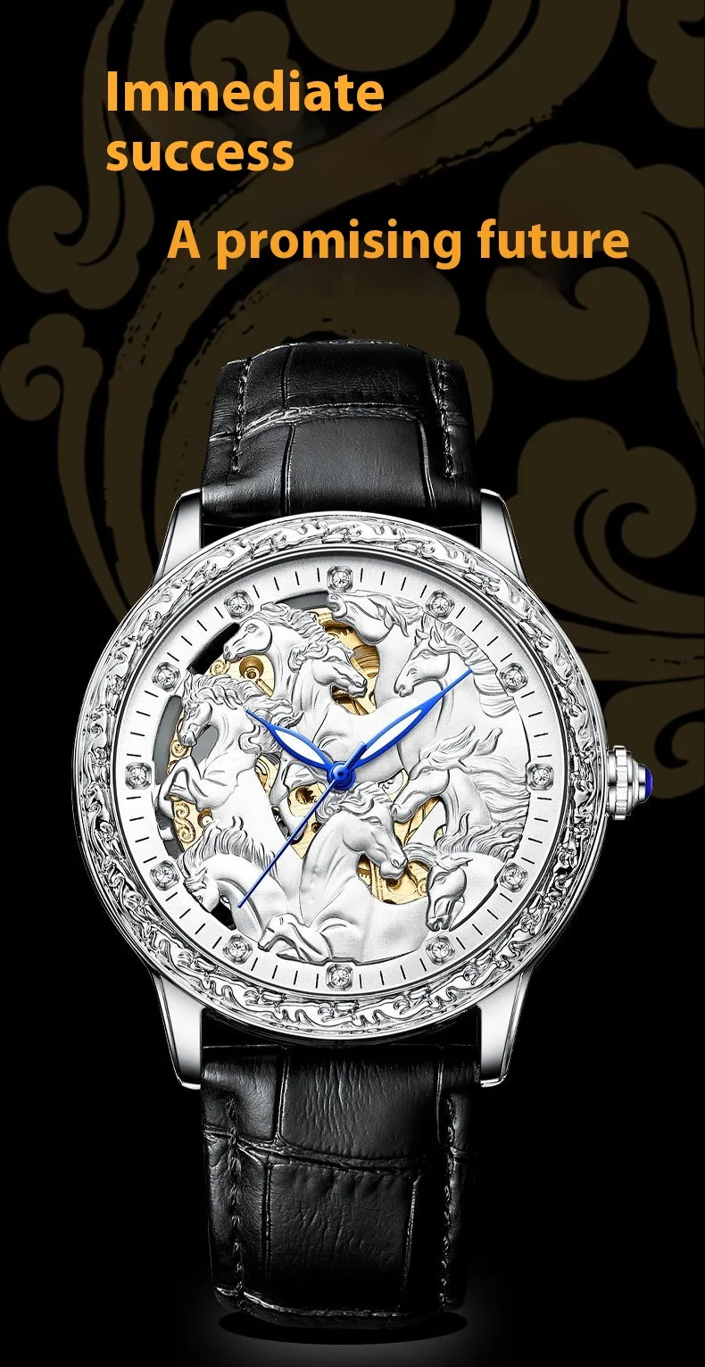 La esfera ahuecada de este reloj ofrece una ventana a la fascinante mecánica de la cronometración. Los engranajes y resortes expuestos exhiben el arte de la relojería, creando una experiencia visualmente cautivadora cada vez que mira su muñeca. Su diseño elegante y audaz te distingue, convirtiéndolo en un accesorio imprescindible para quienes aprecian las cosas buenas de la vida.