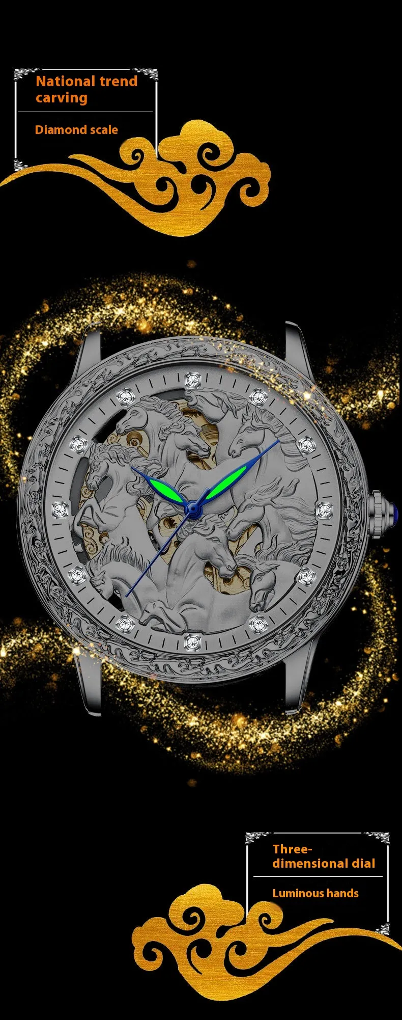 La esfera ahuecada de este reloj ofrece una ventana a la fascinante mecánica de la cronometración. Los engranajes y resortes expuestos exhiben el arte de la relojería, creando una experiencia visualmente cautivadora cada vez que mira su muñeca. Su diseño elegante y audaz te distingue, convirtiéndolo en un accesorio imprescindible para quienes aprecian las cosas buenas de la vida.