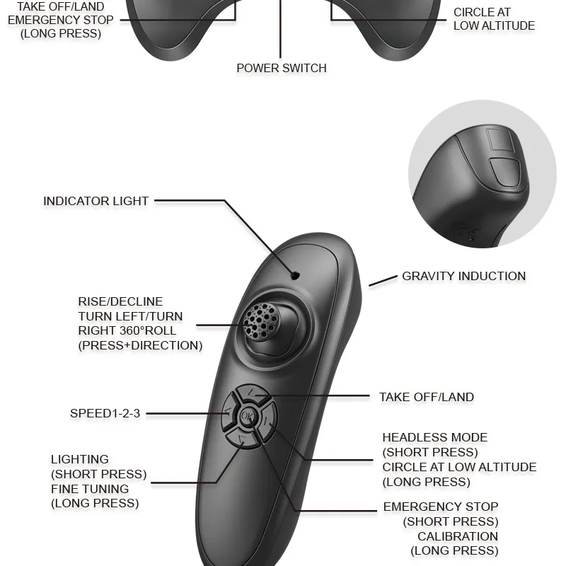 The remote controller allows users to control basic flight movements such as direction and speed. These functions enable pilots to perform fundamental flying actions including: