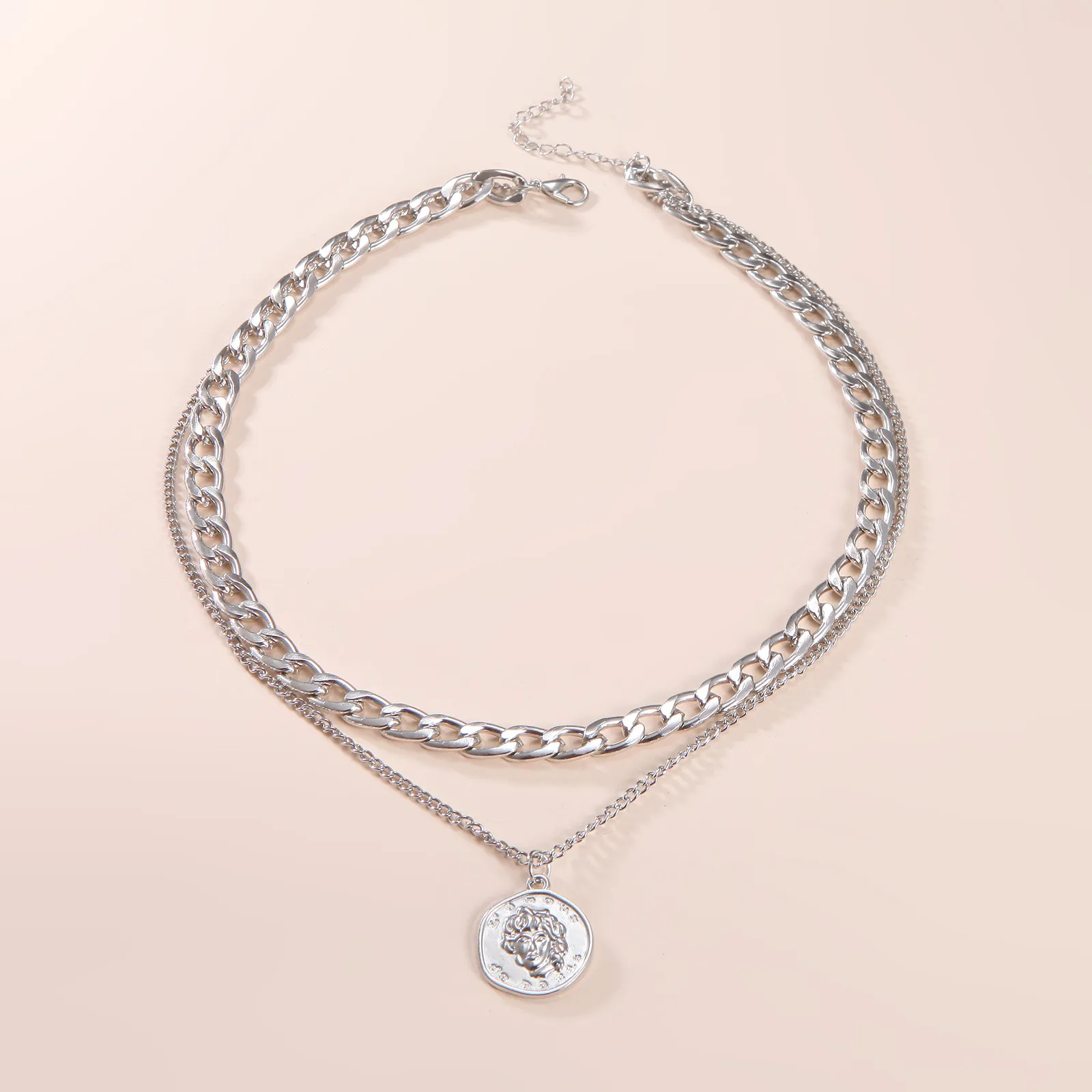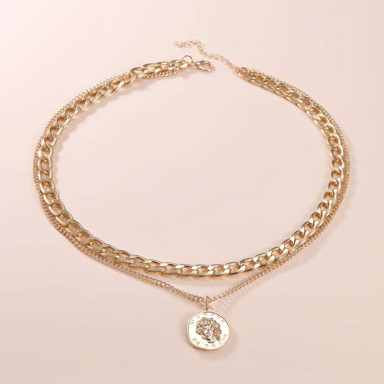 Retro Portrait Exaggerated Thick Chain Necklace Double Layer