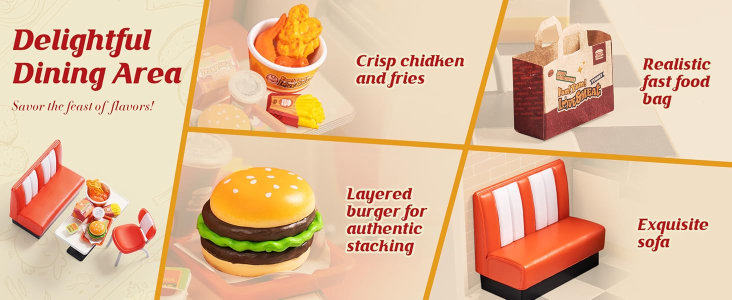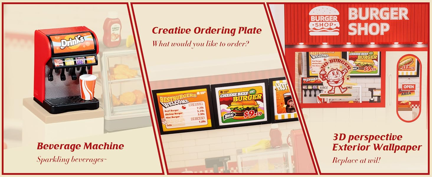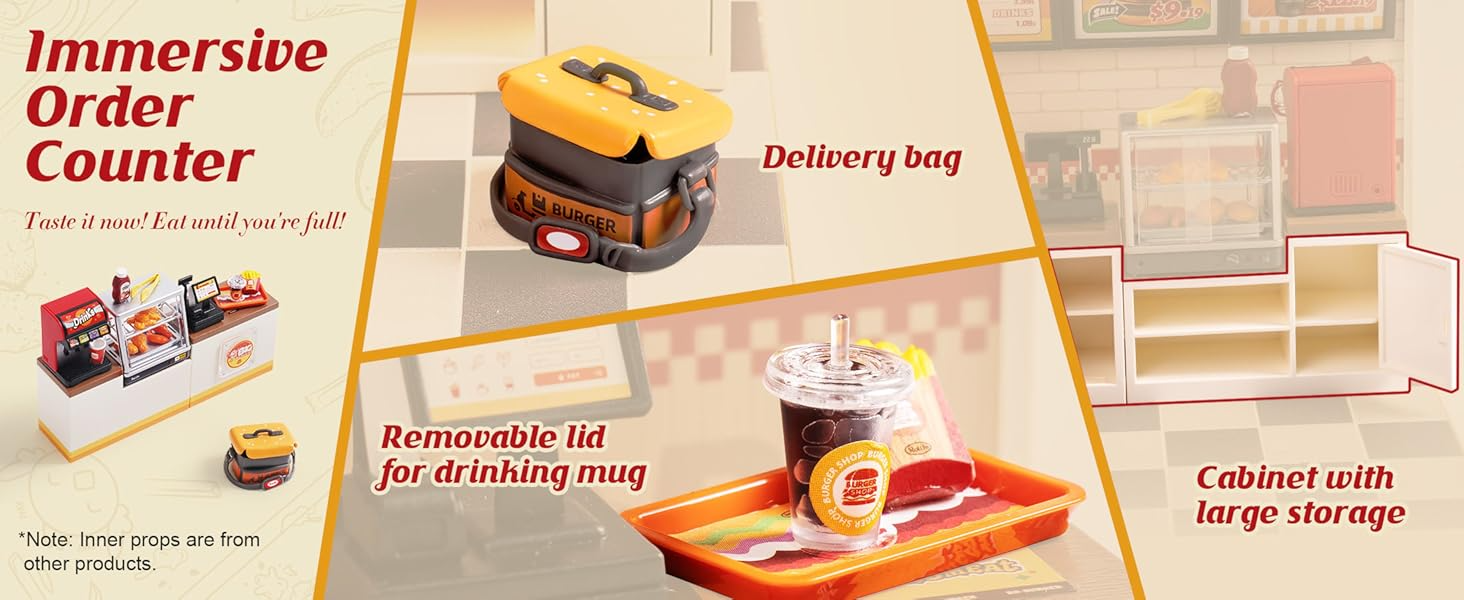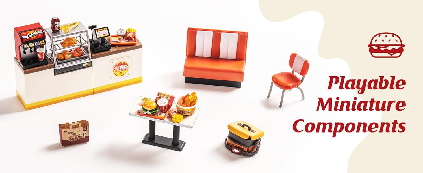 - 【BUILD YOUR OWN BURGER RESTAURANT】DIY burger joint miniature kit features one-room main body with surpriseing details and pre-made furniature: mini drink machine, ordering counter, delivery bag, eating booth with a chiken bucket and burger set, etc.