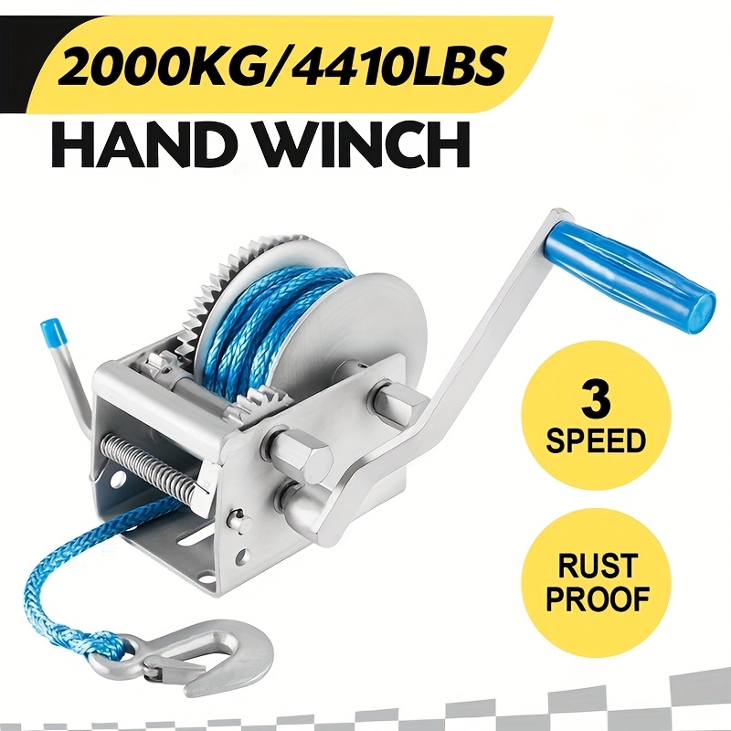 This is a robust hand winch with a capacity of 2000KG/4410LBS, constructed from strong carbon steel. It features a top-quality 7mm diameter by 8m Dyneema synthetic rope, and has a 3-speed gear system with ratios of 17:1, 5:1, and 1:1. The winch is coated with rust-resistant Dacromet and has a stable base equipped with universal mounting holes. The handle can be removed for speed adjustments at any time, and it includes a clevis hook with a safety latch, ensuring durability in all weather conditions.The weight of the package is 4.6 kilograms.