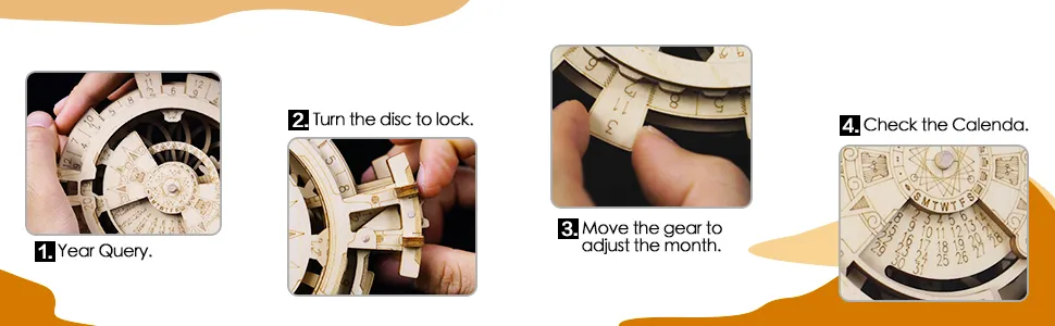 Comience por organizar todas las piezas y seguir las instrucciones claras proporcionadas. Ensamble cada pieza en secuencia, asegurándose de que los engranajes y las ruedas estén correctamente alineados. A medida que avance, ajuste las piezas móviles para asegurar una rotación suave y un funcionamiento correcto. Una vez completado, configure la fecha y el mes girando las ruedas para que coincidan con el día actual. Coloque el calendario en un escritorio, estante o mesa, donde puede servir como pieza decorativa y como un calendario práctico. Disfrute de la satisfacción de su proyecto terminado: un modelo hermoso y funcional que lo mantendrá organizado e inspirado cada día. El kit de modelo de madera del calendario perpetuo 3D ROBOTIME es la combinación perfecta de arte, funcionalidad y desafío intelectual. Diseñado para artesanos de Nueva Zelanda, este rompecabezas DIY ofrece una forma única de llevar un registro de la fecha a la vez que demuestra su amor por las maquetas y la decoración de inspiración vintage. Con piezas de madera de alta calidad, detalles intrincados y un diseño atemporal, este kit de maquetas ofrece un proyecto gratificante y un hermoso producto final.
