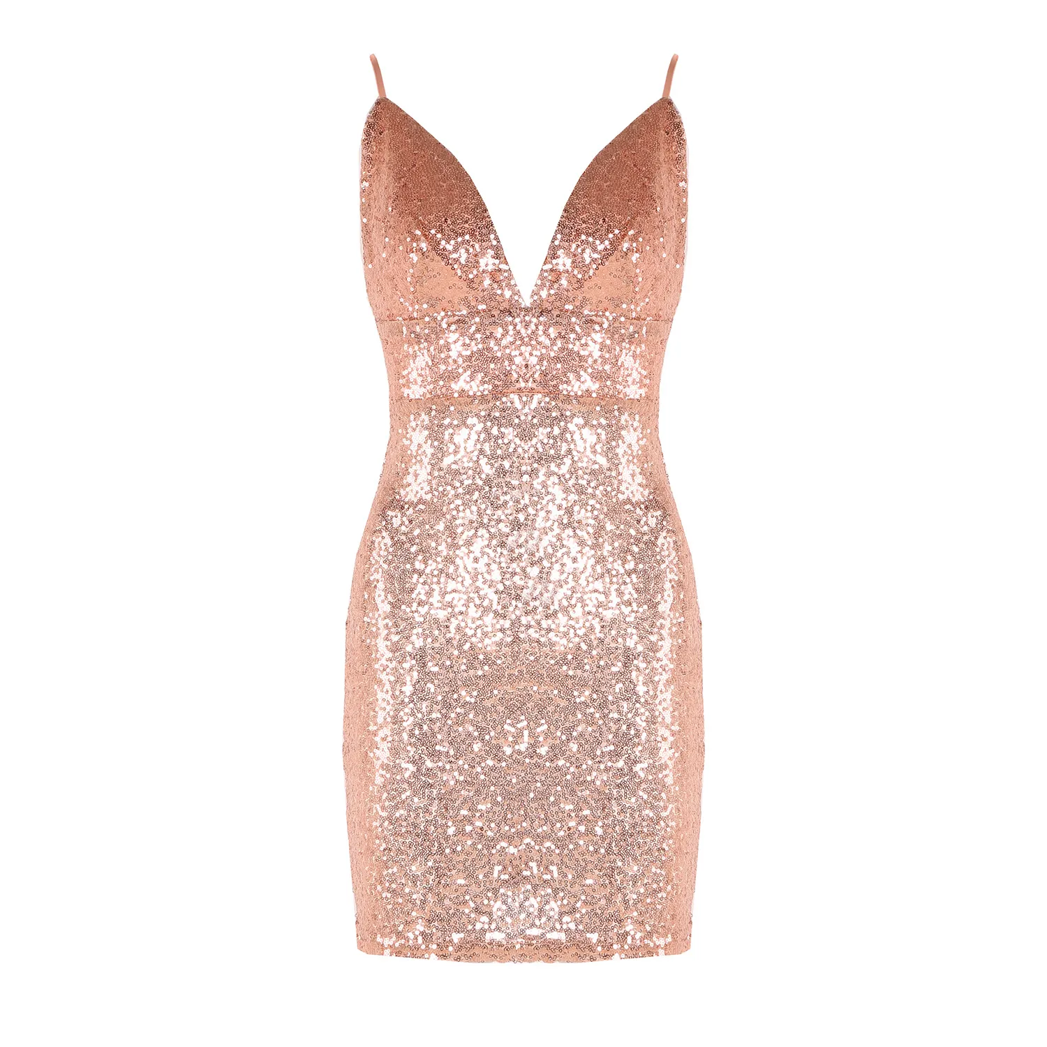 The dress features a form-fitting silhouette that enhances your curves, along with adjustable straps or a sleek neckline, depending on the design. Whether you're attending a wedding, New Year's Eve celebration, or a fancy dinner, this dress provides an ideal blend of glitz and elegance. Its rose gold hue offers a warm, flattering tone, making it a perfect option for a range of skin tones.