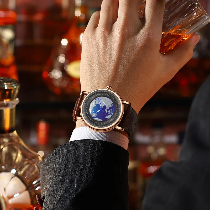 Crafted with high-quality materials, the watch is built to last while maintaining a sleek, sophisticated appearance. The rotating Earth feature allows the wearer to observe the slow, continuous movement of the globe as it spins, giving the watch a truly unique look. It is perfect for those who appreciate the marriage of classic timekeeping with modern aesthetics, making it a conversation starter wherever you go.