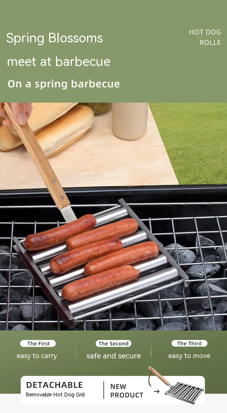 Rotating Hot Dog Grill Rack with Detachable Wood Handle is designed to simplify grilling by allowing even cooking without constant manual turning. The rotating mechanism helps ensure all sides of the hot dogs cook evenly, reducing the risk of burning or uneven heat exposure.