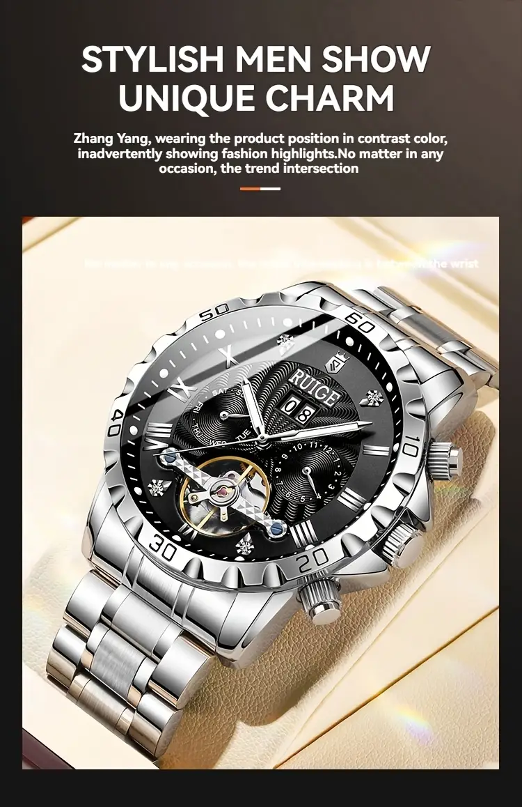 This automatic mechanical movement eliminates the need for batteries, ensuring that you have a timeless piece of craftsmanship on your wrist. Whether you're in a business meeting, at a social event, or simply going about your day, the RUIGE Automatic Mechanical Watch is designed to complement your lifestyle with its sophisticated style and durable craftsmanship.