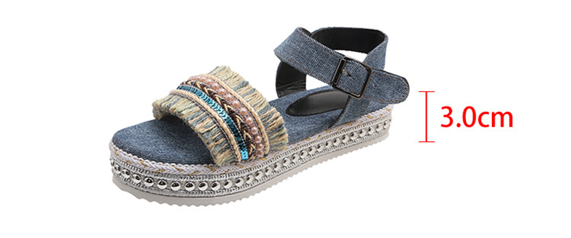 Sandalias de mezclilla con borlas de moda con tacón plano de suela gruesa - Nuevos zapatos de estilo étnico con suela de cuerda de cáñamo de verano para mujer