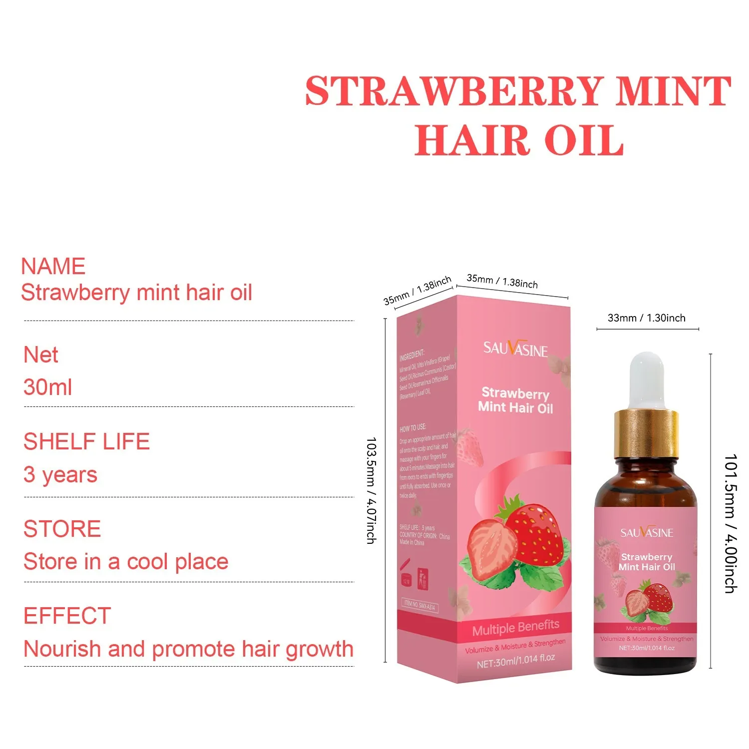 The SAUVASINE Strawberry Mint Hair Oil comes in a 30ml bottle with a dropper applicator that allows precise and controlled application.