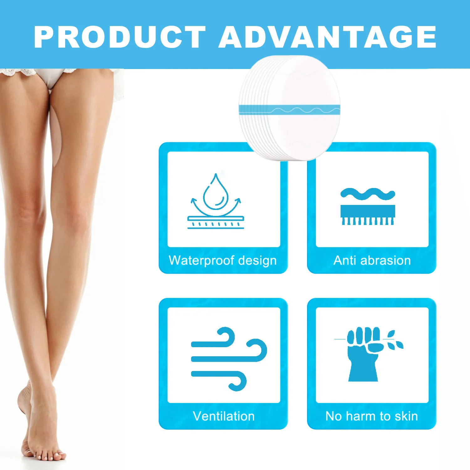 Infused with aloe vera, vitamin E, and natural emollients, each patch also nourishes the skin, promoting healing and softness. The design is discreet and flexible, fitting comfortably under clothing without residue or stickiness. Perfect for summer wear, workouts, or daily use, it’s safe for all skin types and can be used on the inner thighs, underarms, waist, or heels.