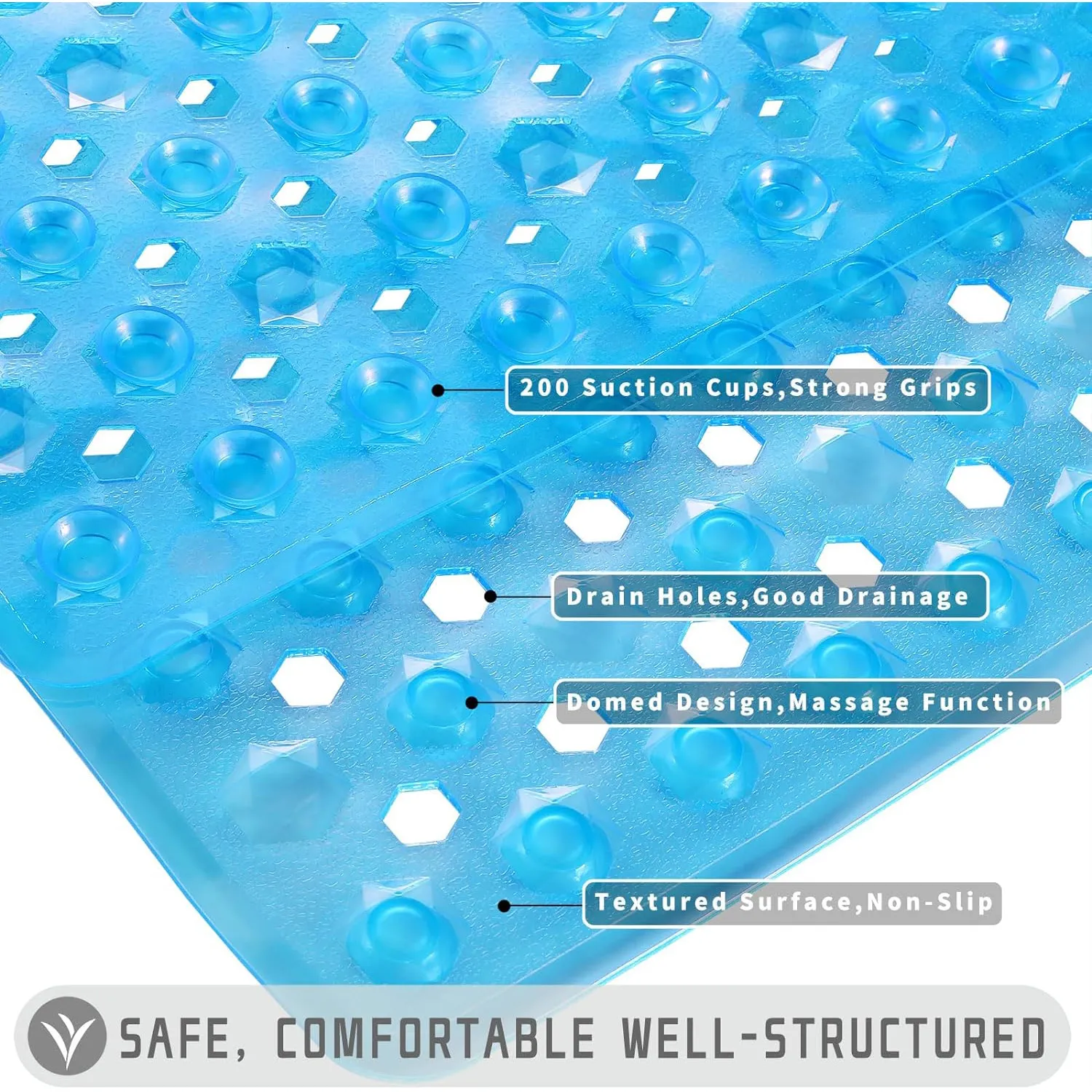 The mat features a high‑friction, textured surface that provides secure footing, reducing the risk of slipping on wet or soapy floors.