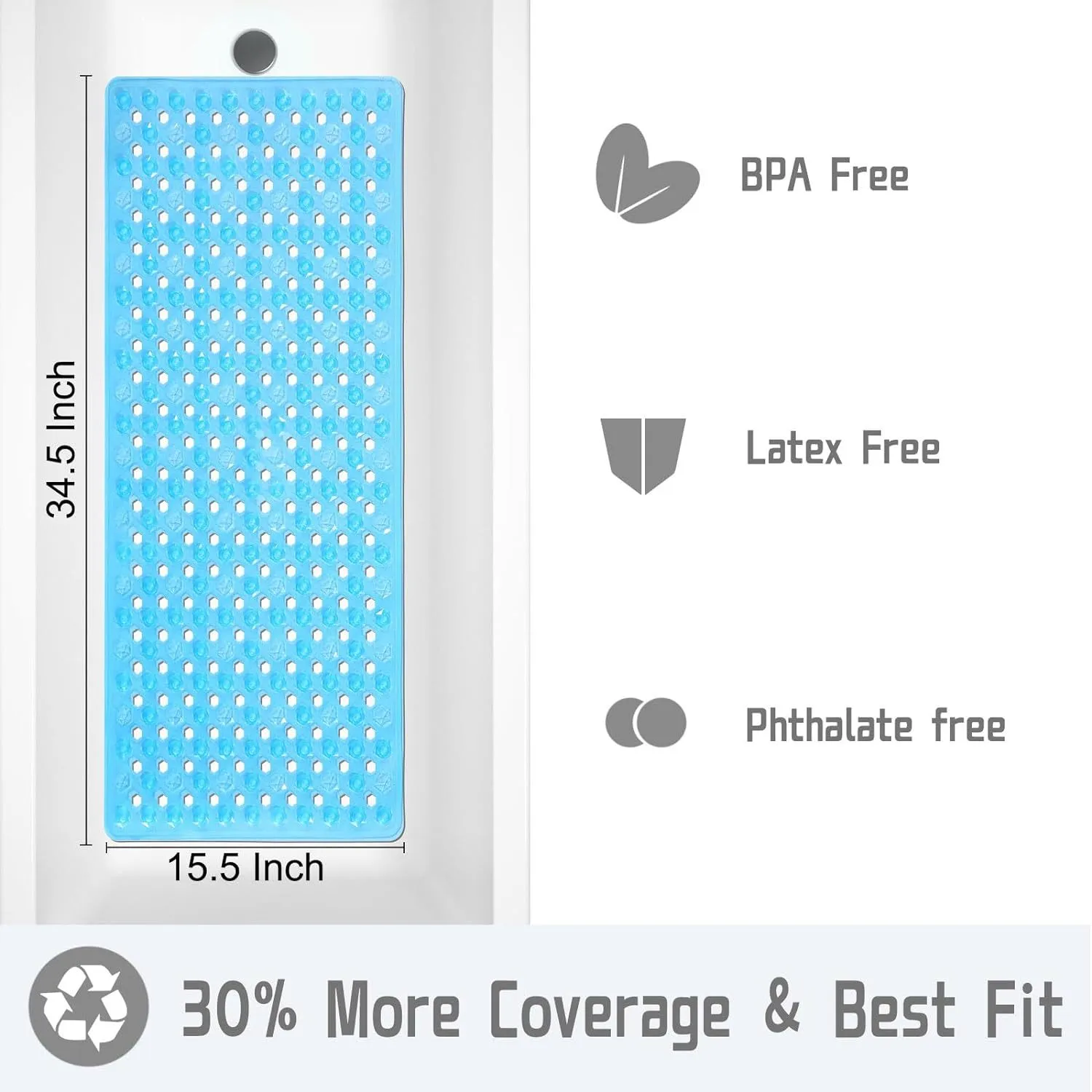 Sized to accommodate standard shower and bath bases, the mat covers a generous area of the floor without blocking drains or interfering with water flow.