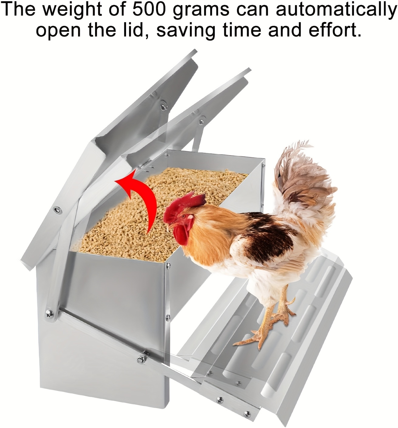 Self-Opening Automatic Chicken Feeder - Durable Metal, No Power Needed, Ideal for Coops & Urban Farming is designed to allow chickens to access feed through a self-opening mechanism. The lid opens when the chicken steps on the platform, ensuring controlled feeding.