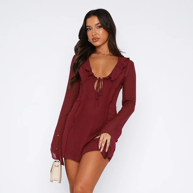 Turn heads and feel confident with the Sexy Ruffled V-Neck Lace-Up Long-Sleeve Dress. Order now and embrace the Y2K-inspired, sultry look with this trendy, body-hugging mini dress, perfect for any occasion!