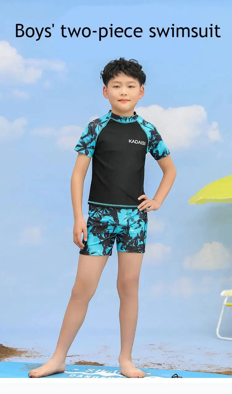 Size: 5T, Color: Blue - Summer Children's Two-piece Polyester Medium Children's Short-sleeved Young Boys Western Style Hot Spring Swimsuit