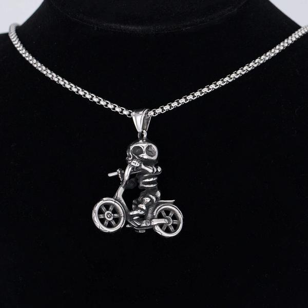 The detailed skull design, combined with bicycle elements such as gears and handlebars, creates a visually striking pendant that represents both a love for cycling and the fearless attitude of those who ride.