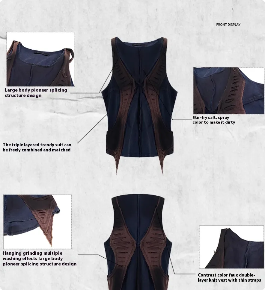 Versatile Style: The vest’s spliced design and unique color make it a versatile piece, suitable for pairing with a variety