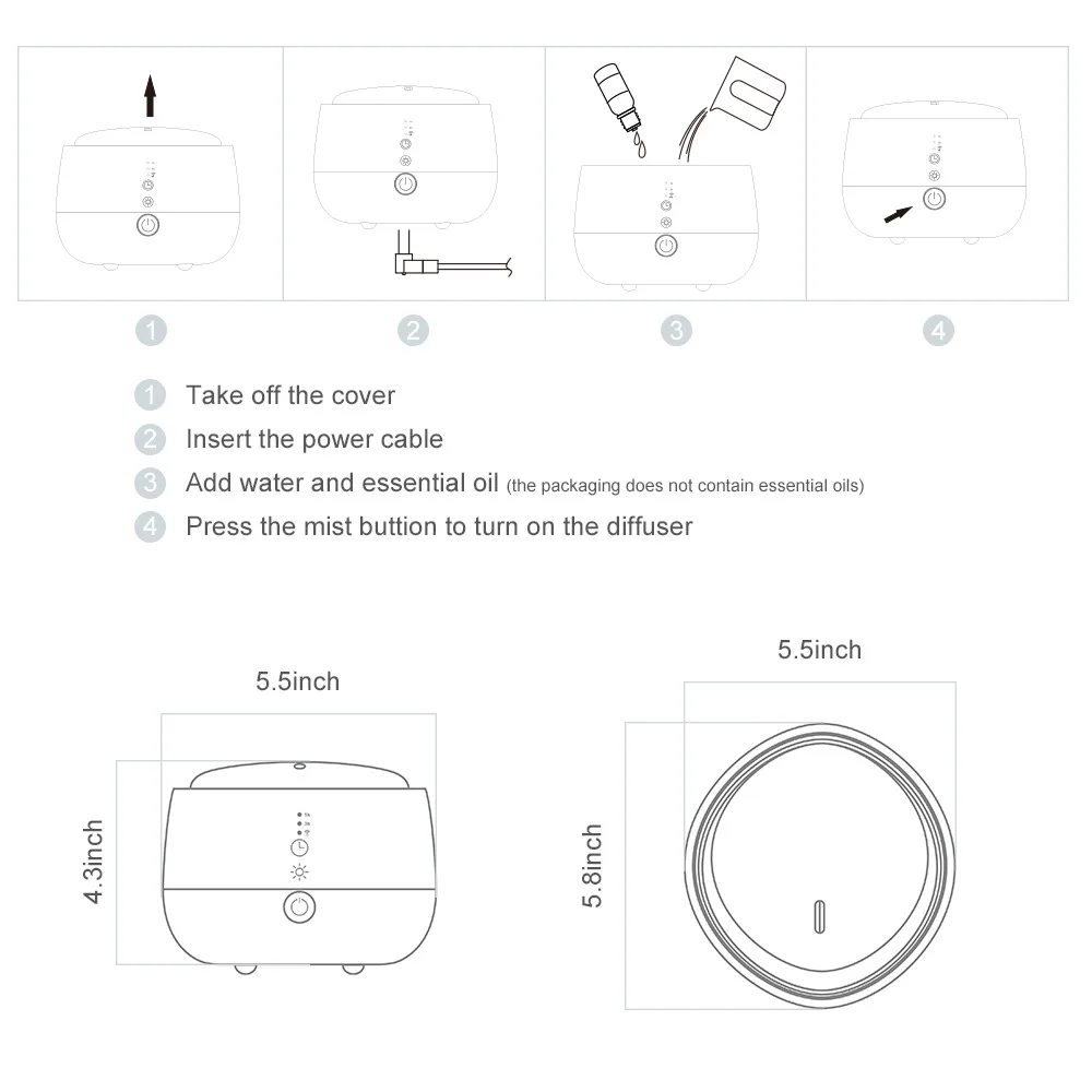The main functions of the product are air purifier, colorful lights with adjustable color, humidifier, aroma diffuser, touch adjustment