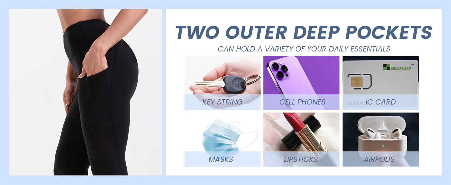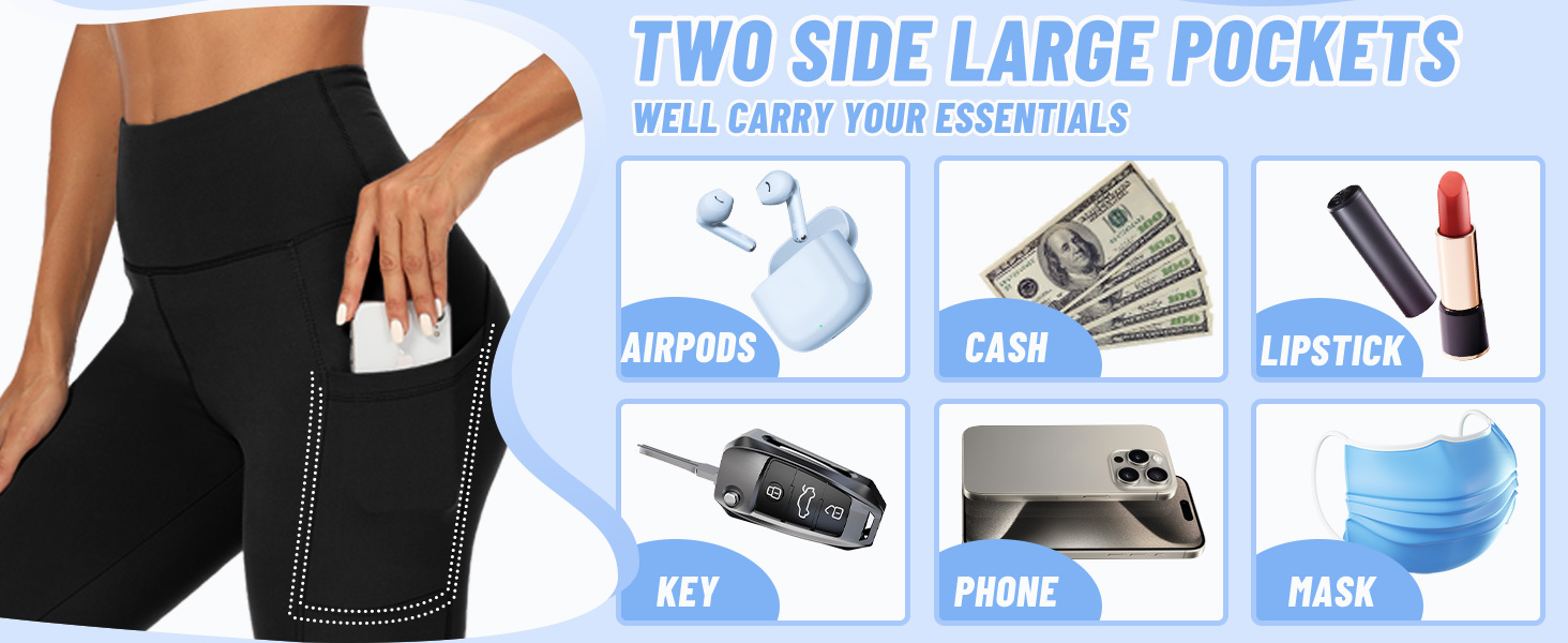 - Womens Yoga Pants With 3 Pockets: Ewedoos squat-proof workout leggings with pockets for women feature 2 large side pockets and 1 drop-in pocket, which easily store your phone or other essentials. They're the pair you'll reach for whether you need something for your everyday run, everyday practice or just every day.